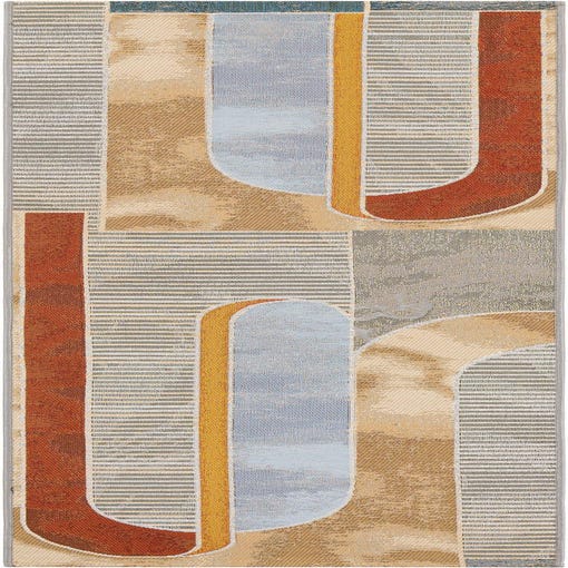 A modern, geometric runner with a balanced mix of rounded arches and narrow stripe bands, this rug uses clean shapes to create a rhythmic, architectural layout. The multi-hued background supports bands and blocks of beige, brown, ivory, peach and yellow that layer against one another, producing contrast between soft, sandy tones and brighter accents. The surface reads as low-profile with a subtle ribbed texture where the pattern is defined, giving the rug a tactile quality underfoot without adding bulk.