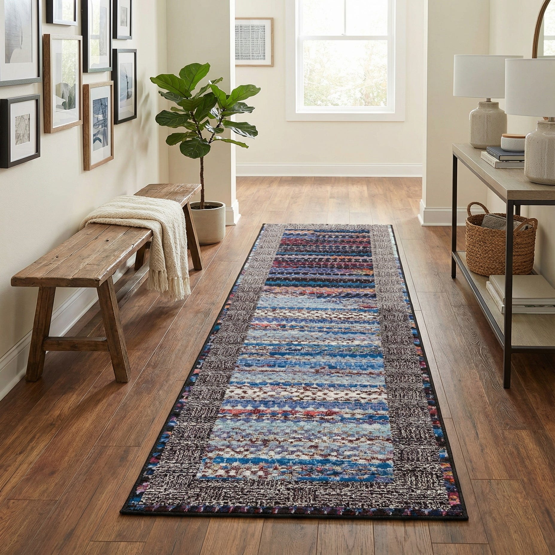 A vibrant multi-colored runner rug with horizontal stripes and textured gray borders, ideal for a hallway or patio.