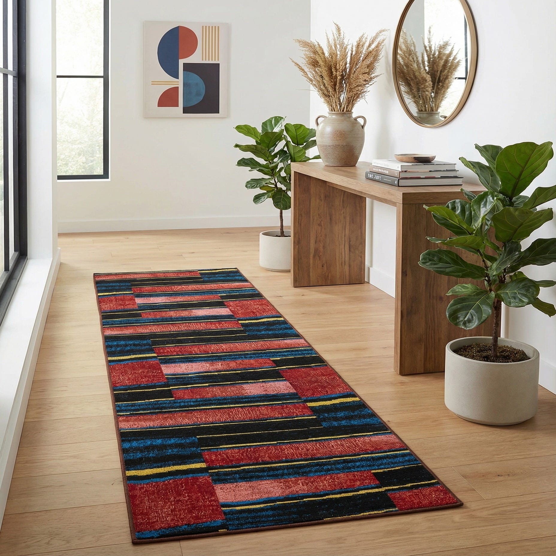 A multi-colored 8 ft runner rug with a modern stripe pattern in black, red, blue, and yellow, ideal for hallways or patios.