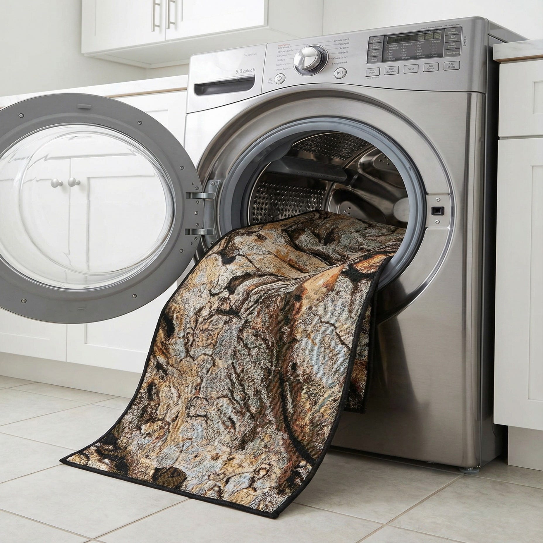 A multi-colored 8 ft runner rug with a modern, abstract pattern resembling natural rock formations, suitable for a hallway or patio.