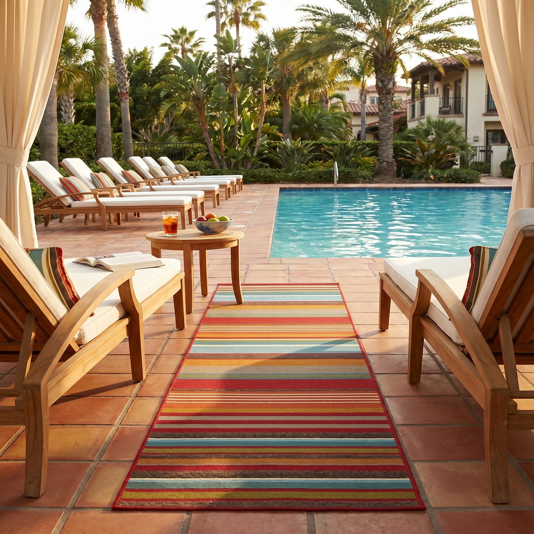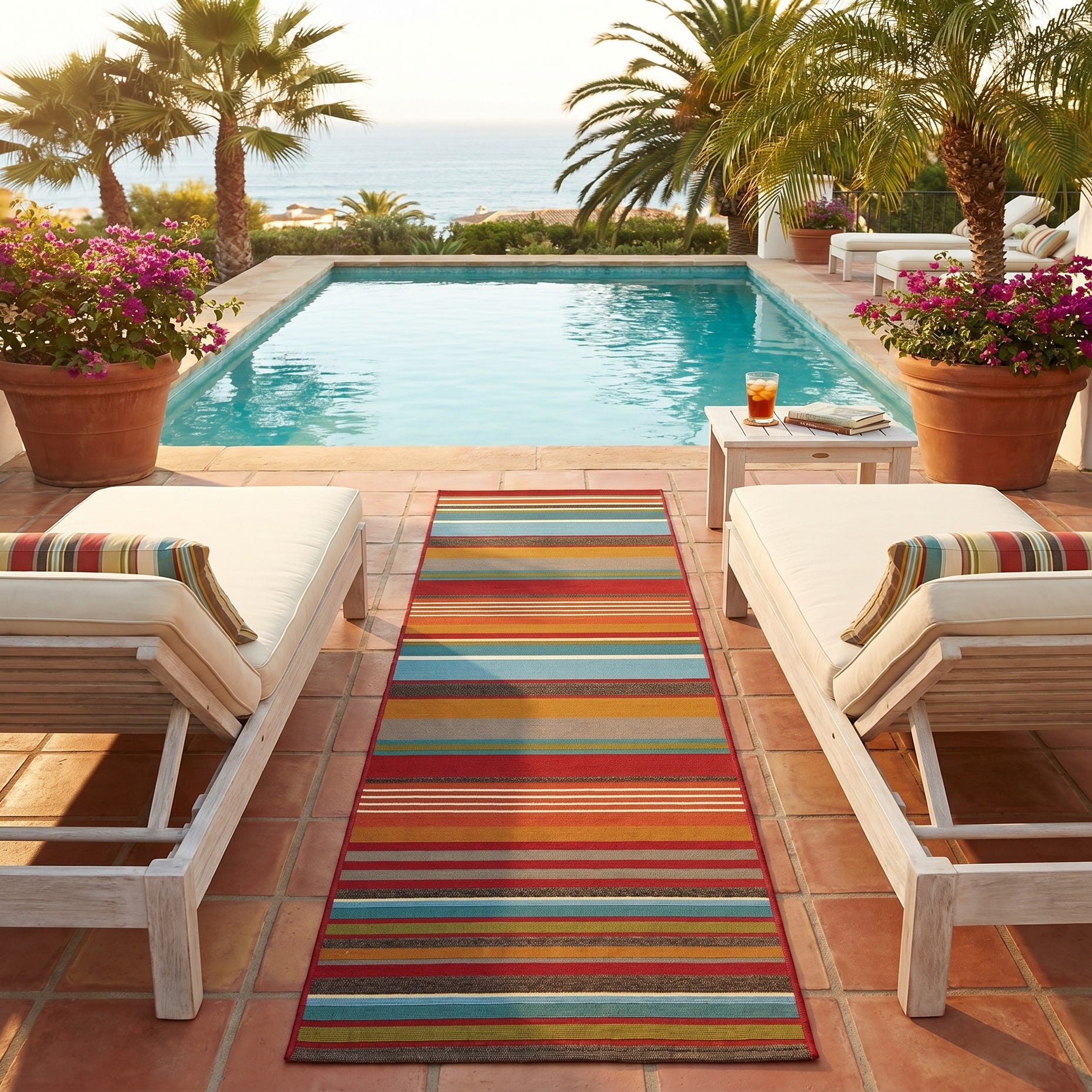 Fell in love with this rug when I saw it on-line for its delightful pattern and vivid colors. It arrived in two days from the day ordered about a week ago. We put it down on our renovated deck today...it is even more awesome than we thought it would be! The colors and pattern outset the colors of the deck perfectly.