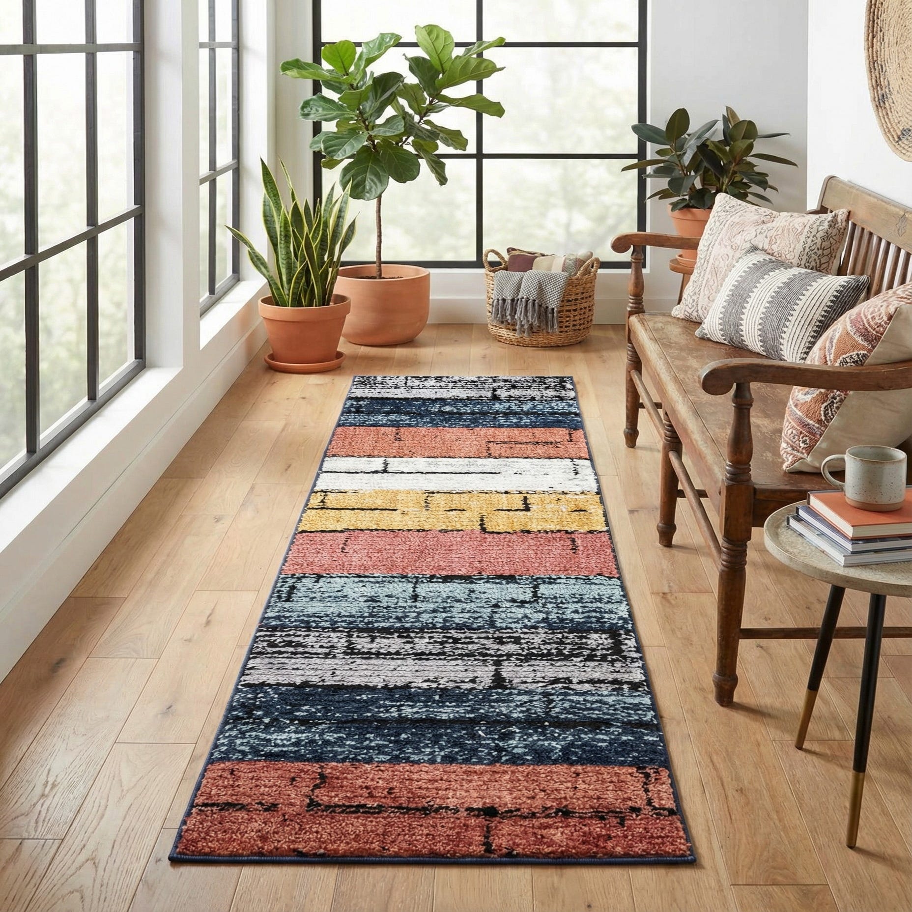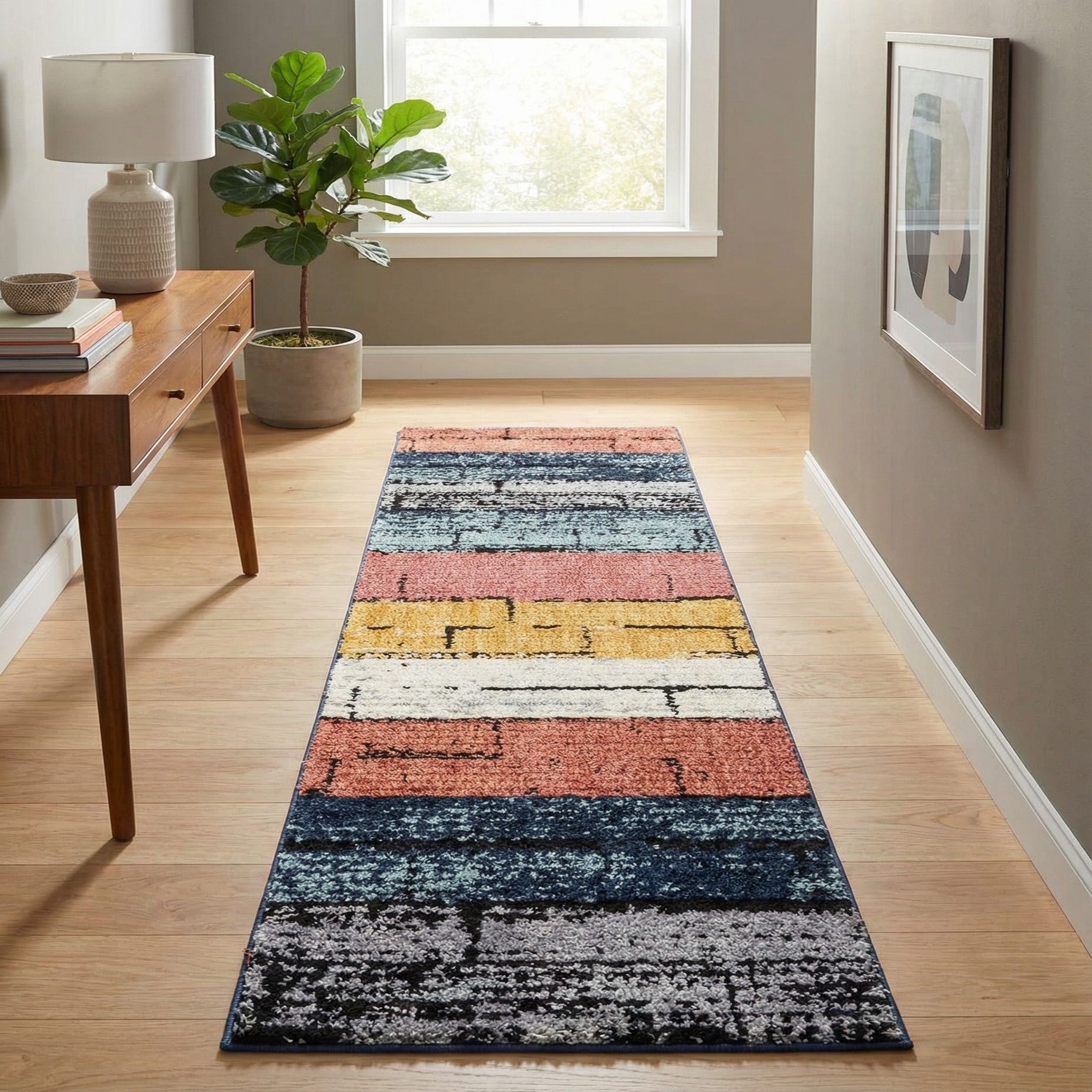 Machine-made from 100% polyester, the pile is soft and cushiony with a subtle high-low texture that you can feel when you run your hand across it, adding depth and dimension to the surface. This runner works well in narrow spaces—hallways, entryways, or alongside a kitchen island—or layered in front of a sofa to introduce color and pattern. Pair it with warm wood floors and brass or matte black accents for a mid-century modern look, anchor a casual coastal or bohemian room with navy and ivory textiles, or use it to add a playful contrast to pared-back, neutral furnishings.