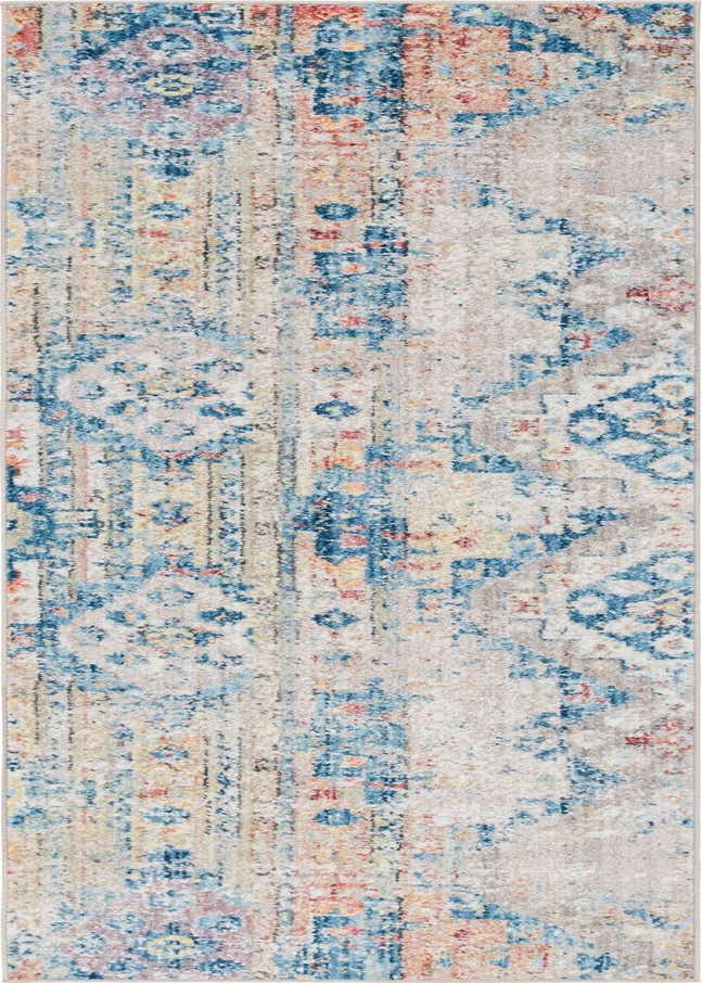 Primary color is Multi. Colors in this rug include: Multi, Beige, Blue, Light Green, Navy Blue, Orange, Red.