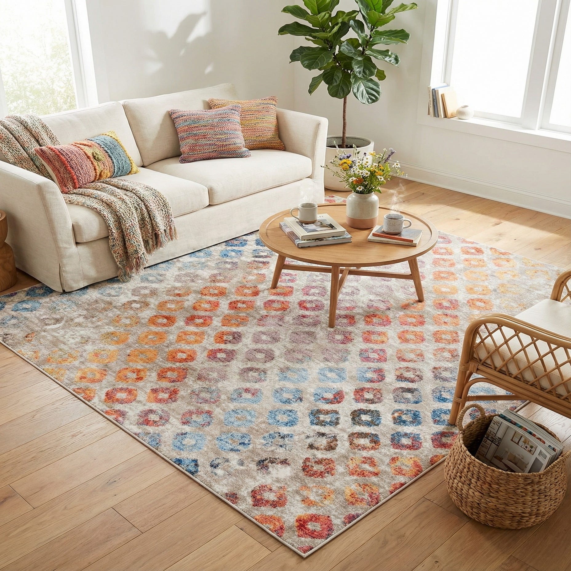 A square multi-colored Bohemian area rug featuring a distressed trellis pattern in shades of blue, orange, red, and purple on a light background.