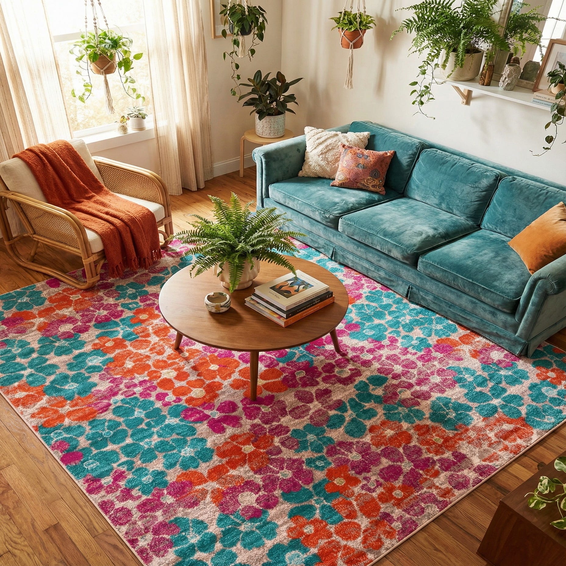 Machine-made from 100% polypropylene, the rug has a low, dense pile with a pleasant, slightly plush hand that feels comfortable underfoot and holds the printed detail clearly. It works well as a colorful anchor in a casual living room or family space, a bright focal point in a sunroom or breakfast nook, or as a playful layer in a bohemian or eclectic bedroom. Pair it with neutral upholstery and natural wood tones to let the color story pop, or mix it with textured rugs and wicker accents for a relaxed, layered look.