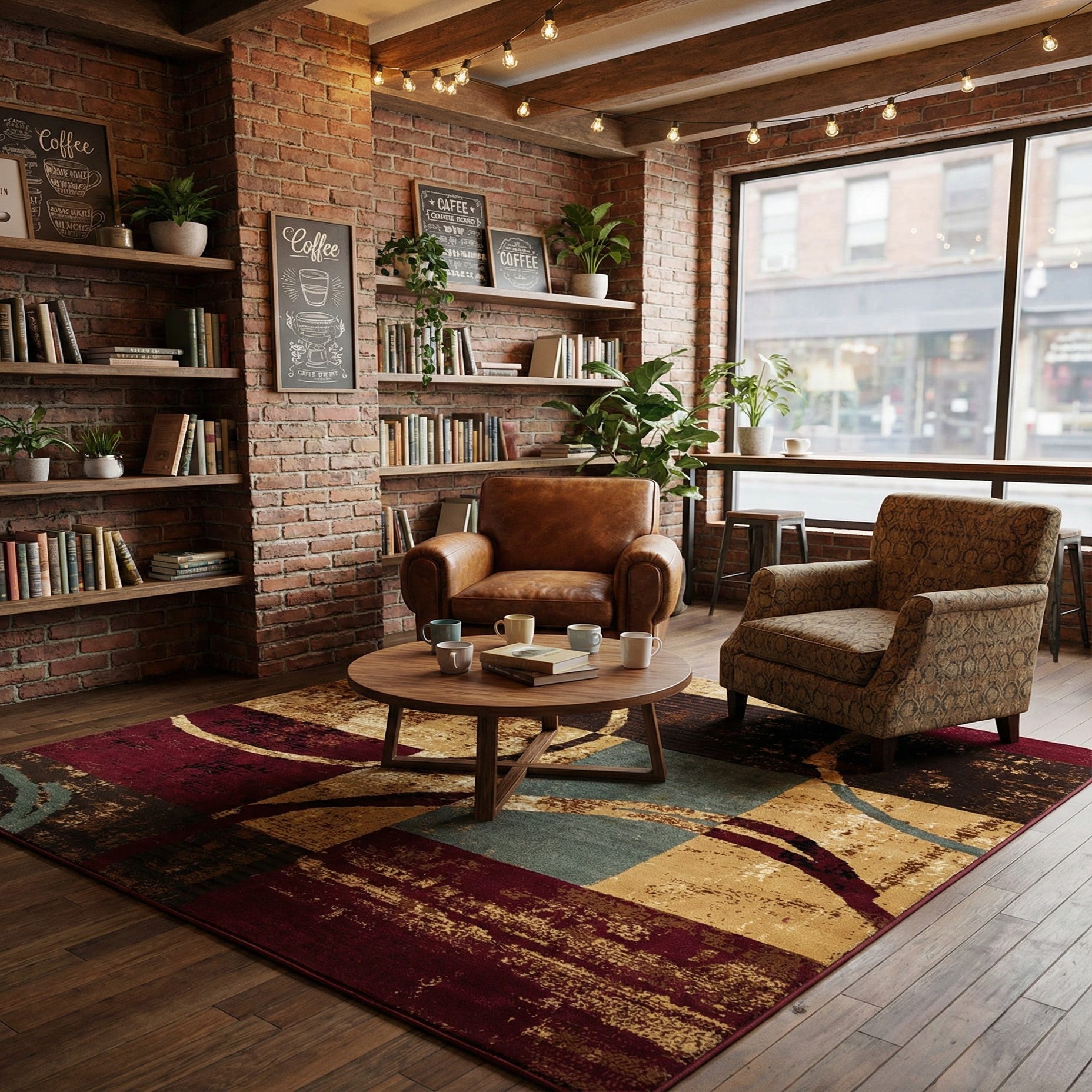 This rug works well beneath a coffee table in a living room with warm wood or leather furnishings, or under a dining table where the richer burgundy and brown tones can anchor the space. It also pairs easily with industrial or mid-century modern elements—think metal-framed lighting, neutral upholstery and olive- or gray-toned accents. Use it to add visual depth in a home office or to bring warmth and color to an entryway while keeping the overall look contemporary and grounded.