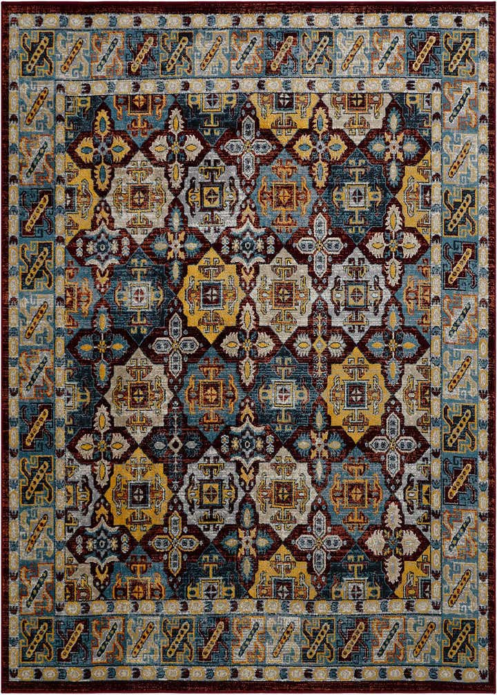 Primary color is Multi. Colors in this rug include: Multi, Black, Blue, Gray, Ivory, Red, Yellow, Beige.