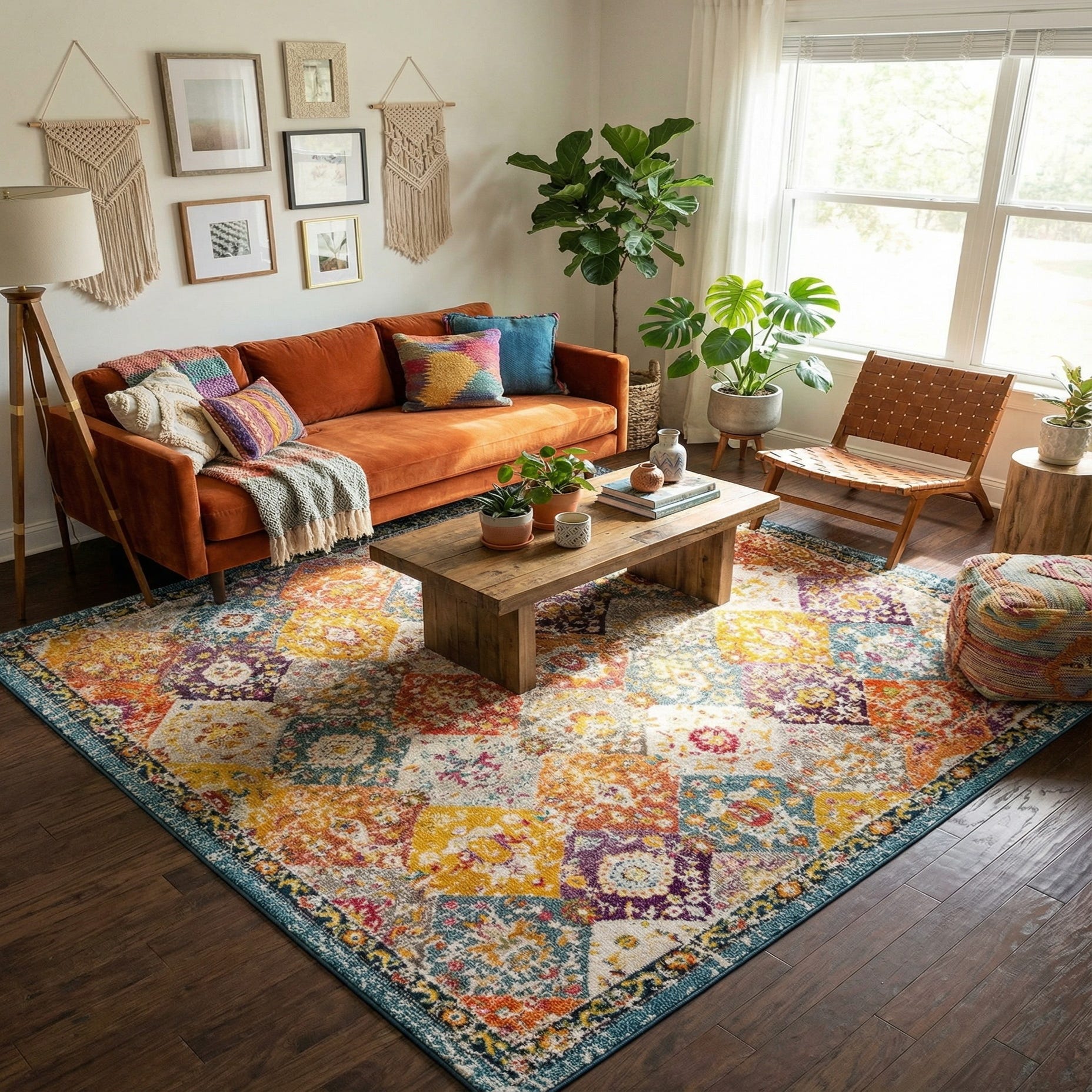 The lively palette and mixed-motif layout work well in casual and eclectic interiors — pair it with a neutral sofa and warm wood furniture to let the colors take center stage, or layer it with rattan and woven accents for a bohemian vibe. It also pairs nicely with mid-century modern pieces and jewel-toned accents in a home office or living room, and can bring energy to a dining area or creative studio where color and pattern are welcome.