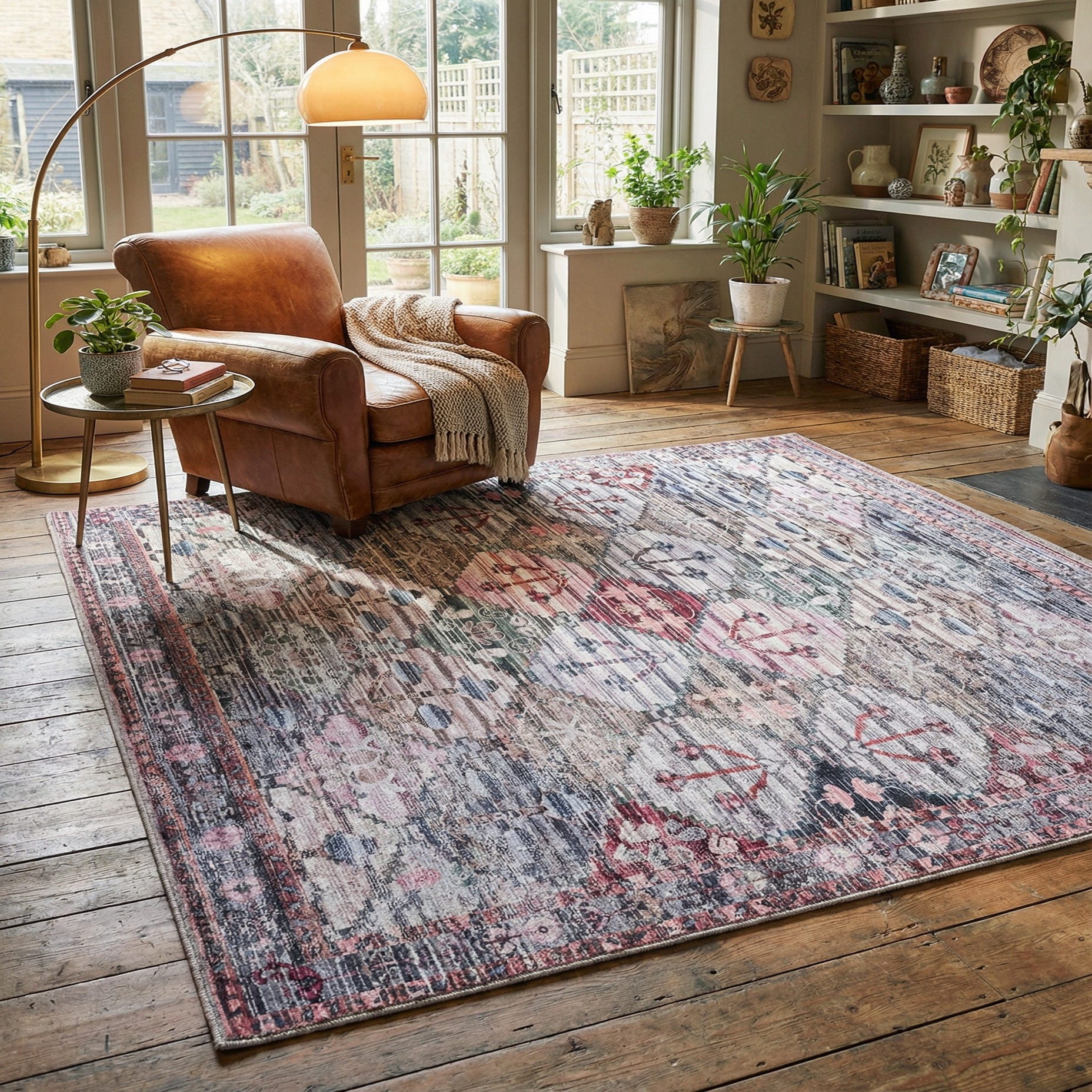 A lively medallion pattern unfolds across a multi-tonal background, where diamond motifs and subtle floral accents are softened by a gently distressed finish. Hues of beige, gray, navy and light blue sit alongside pops of pink and red, creating a layered, lived-in palette that brings depth without overwhelming the room. Vertical striations in the weave add a touch of texture and movement, giving the design an antique character with a contemporary edge.