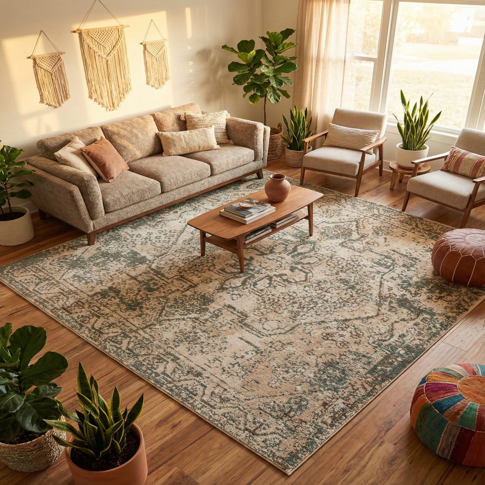 This rug works well as an anchor for a neutral living room or an entry that needs a welcoming, lived-in touch. Pair it with warm wood furniture and teal or gray accents for a balanced, transitional feel, or layer it under a round dining table to soften lines and add subtle pattern. It also complements modern farmhouse, coastal, and eclectic interiors where a muted, vintage look ties varied elements together.
