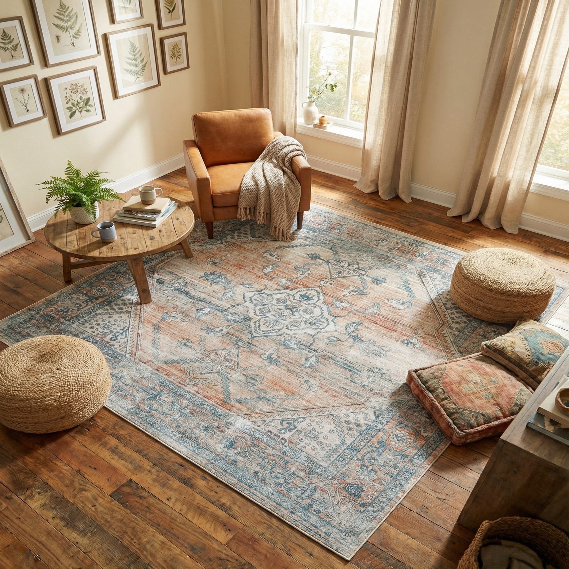 Place this rug beneath a sofa and coffee table to ground a living area, under a dining table to add muted pattern, or in a bedroom to introduce layered color without overwhelming the space. It pairs well with coastal-modern or transitional interiors, warm wood tones and neutral upholstery, and also brings cohesion to bohemian or farmhouse looks when combined with woven textures and blue accents. The mix of cool blues and warm rusts makes it easy to coordinate with both cool and warm color schemes.