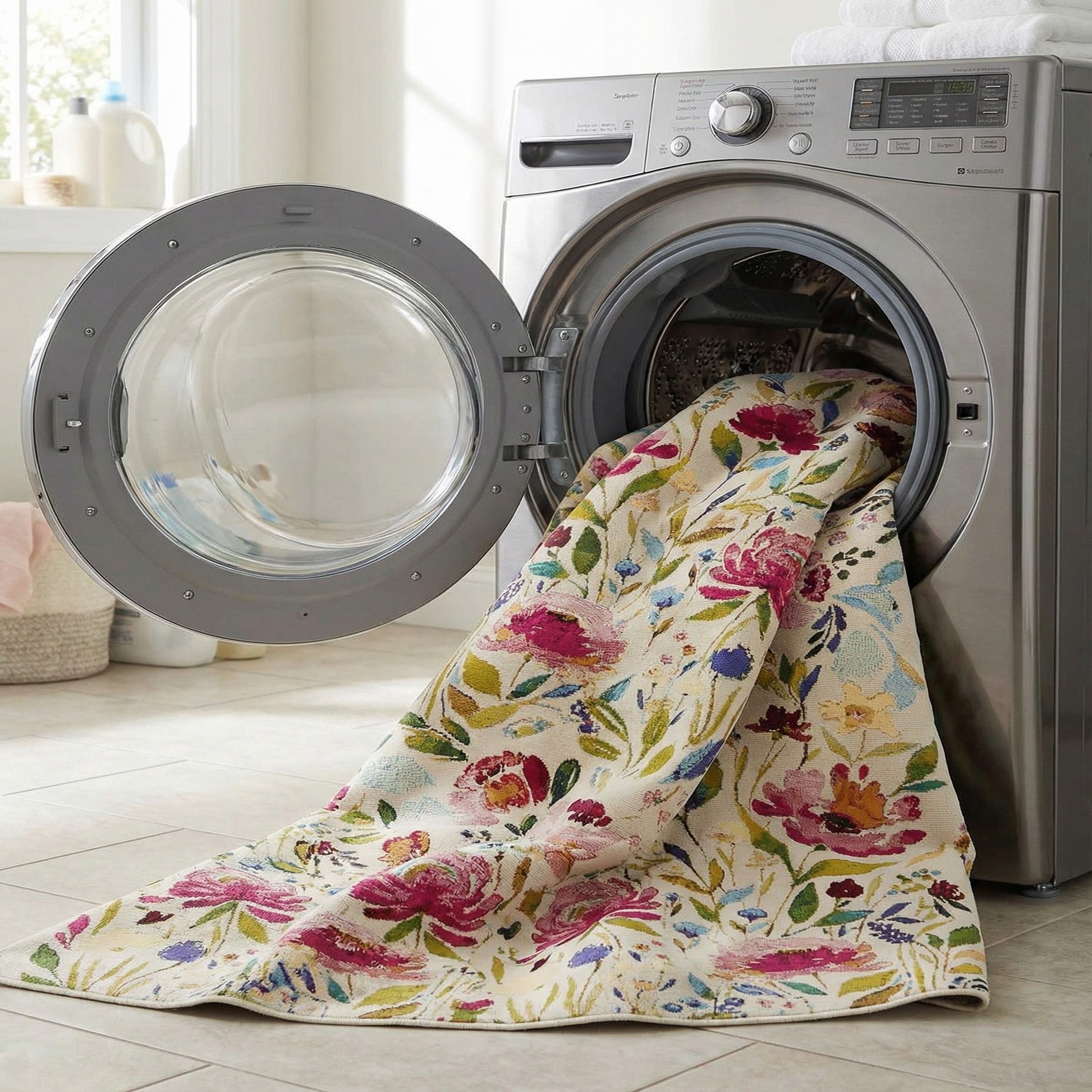 This piece works well on a covered patio or sunroom to bring a garden-inspired pop to outdoor seating, or indoors beneath a casual dining table or in a bright, airy living area. Pair it with woven rattan or teak furniture, crisp white linens and accent pillows in navy or blush for a relaxed cottage or coastal vibe, or layer it with mixed-print cushions and eclectic art for a bohemian or transitional space.