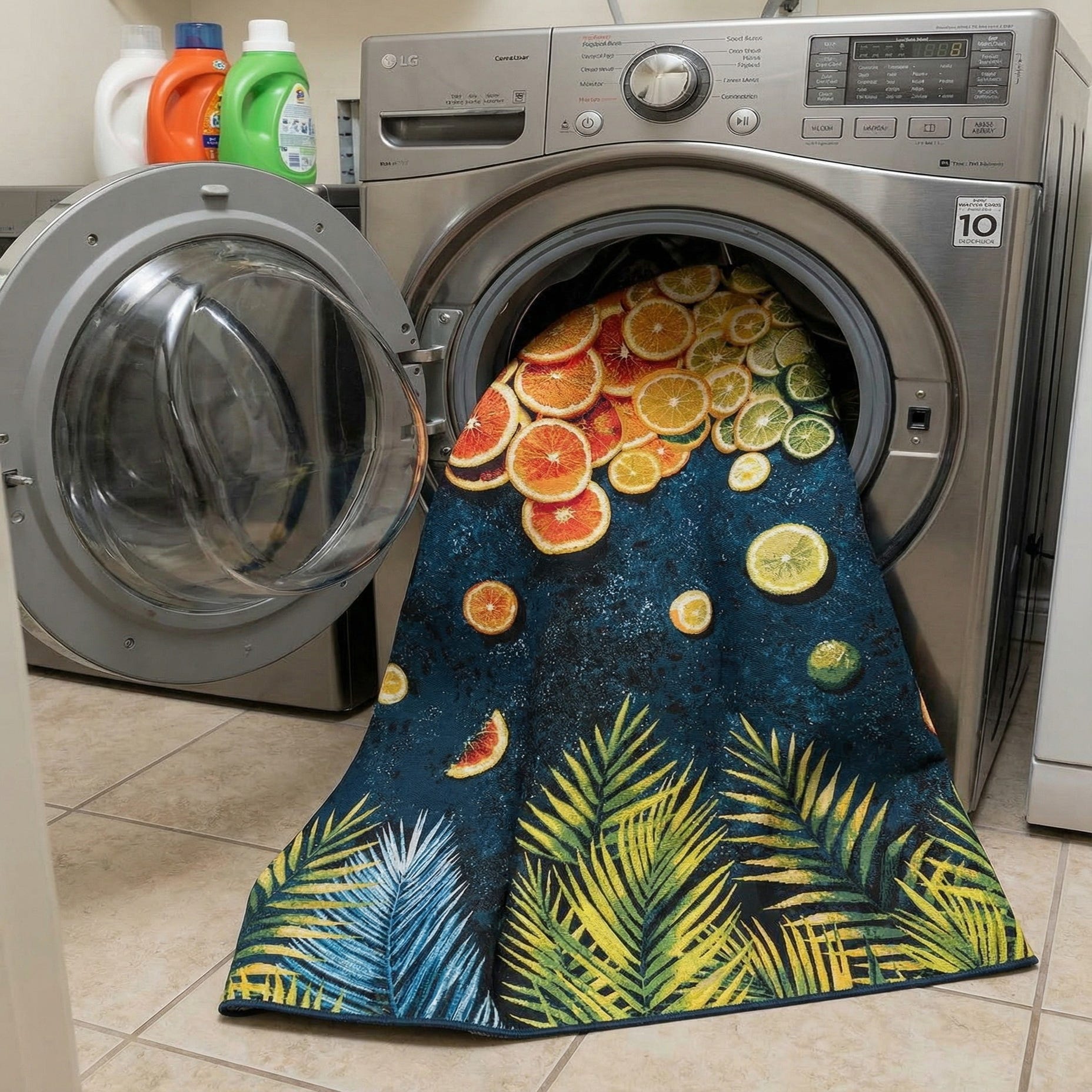 A vibrant square rug with a dark blue background, featuring a pile of citrus slices (limes, lemons, oranges, grapefruits) at the bottom and scattered slices above, with green and blue palm fronds at the top.