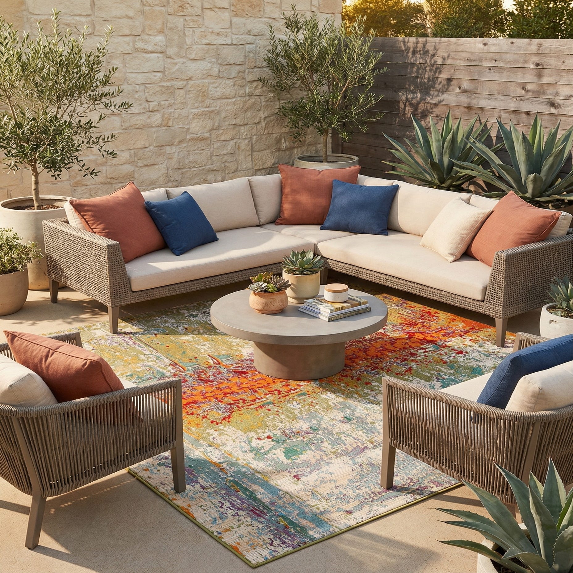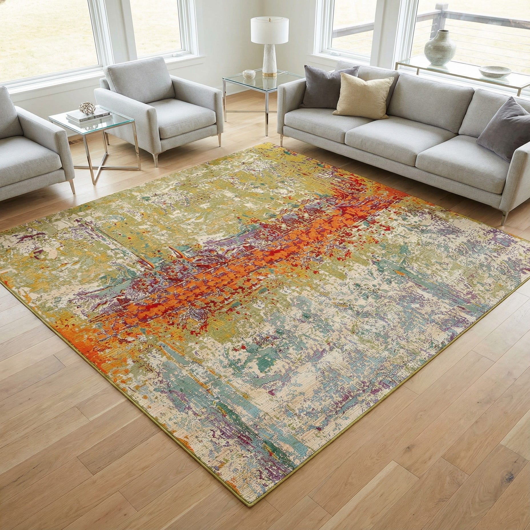 Place this rug where a contemporary or eclectic scheme needs an artistic focal point: under a modern coffee table in an open-plan living room, on a covered patio or sunroom to anchor seating, or beneath a dining table to add layered color without heavy texture. It pairs well with clean-lined furniture in neutral tones, woven outdoor seating, or layered with solid cushions and throws to balance the lively pattern.