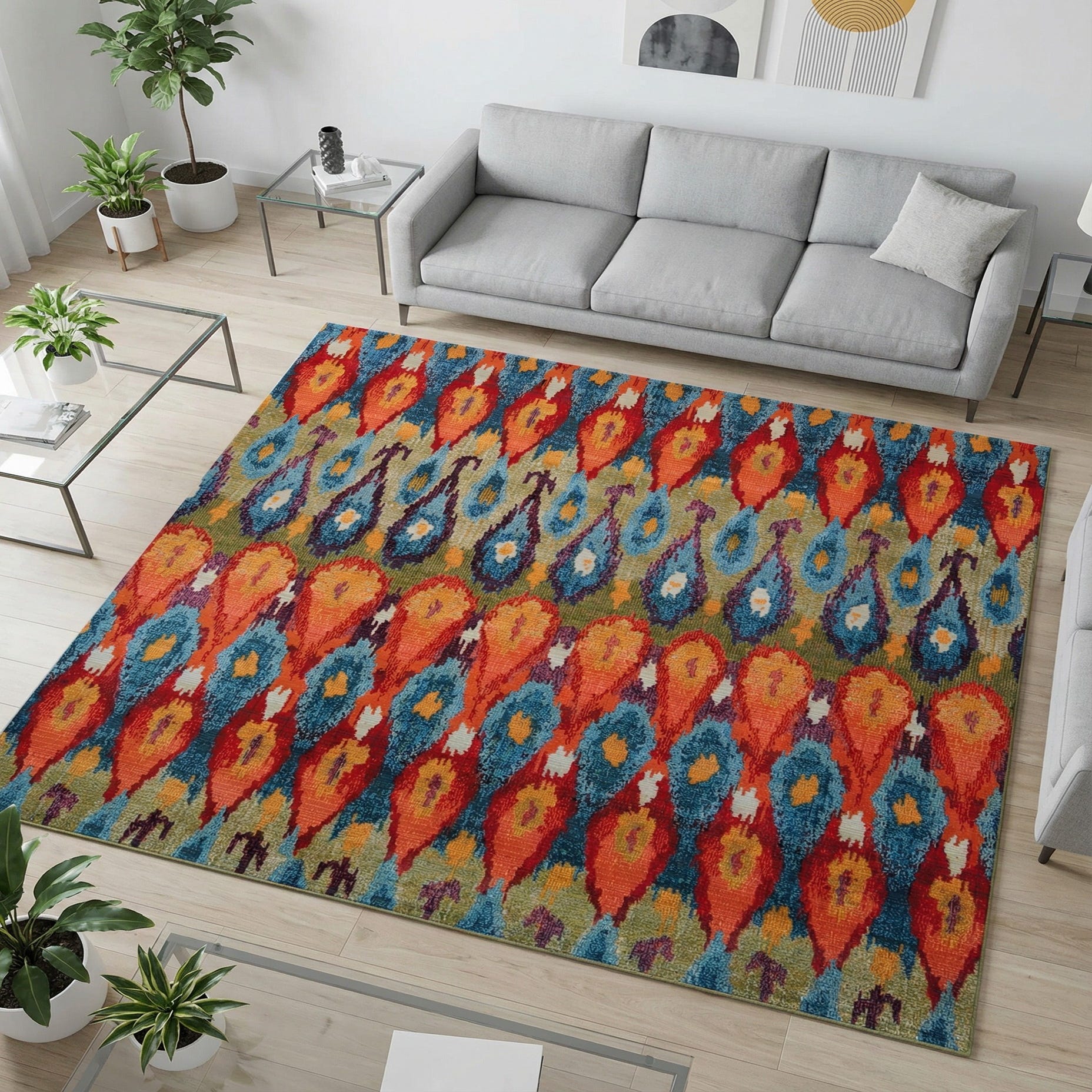 A lively ikat-inspired pattern of elongated teardrops marches across a multi background, rendered with a painterly, slightly blurred edge that gives the design depth and movement. Warm tones of burgundy, red, orange and gold sit alongside cooler bands of light blue, navy and olive, with pops of purple and yellow to enliven the composition. Machine-made of 100% polypropylene, the rug has a low, tightly constructed pile that feels firm underfoot while still showing clear texture—enough tactile interest to feel substantial without being bulky.