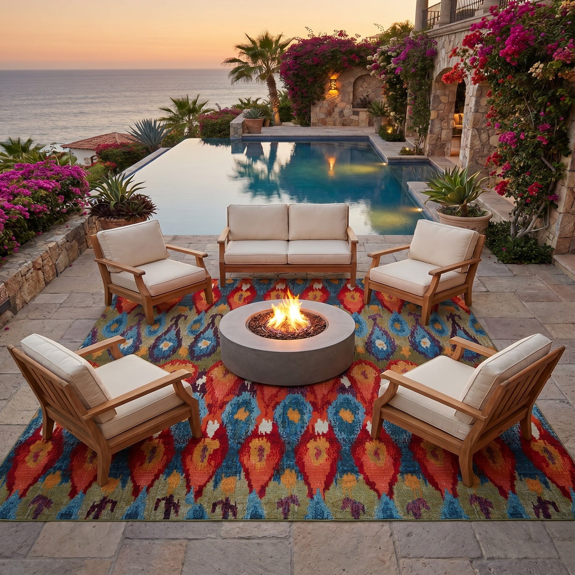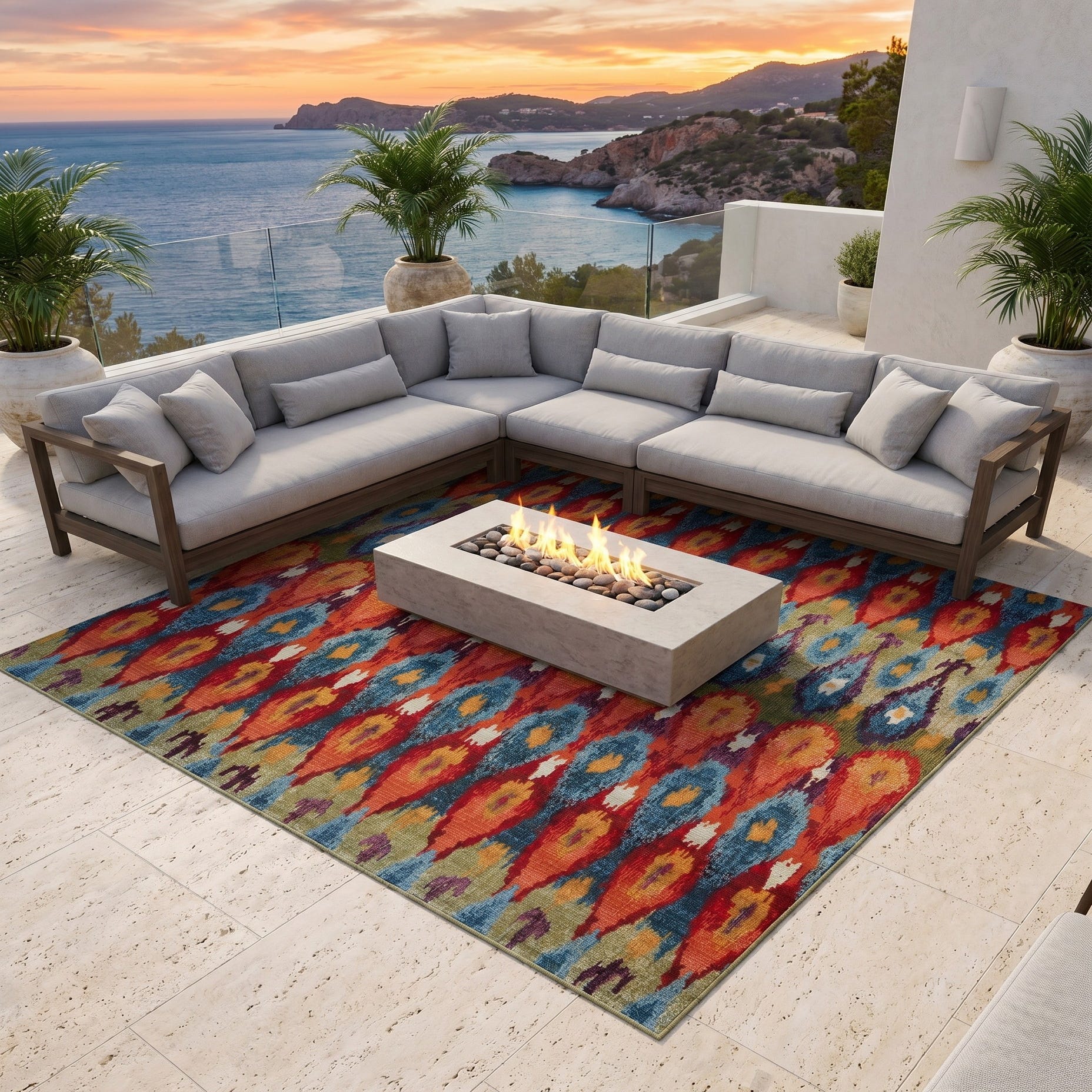 Fell in love with this rug when I saw it on-line for its delightful pattern and vivid colors. It arrived in two days from the day ordered about a week ago. We put it down on our renovated deck today...it is even more awesome than we thought it would be! The colors and pattern outset the colors of the deck perfectly.