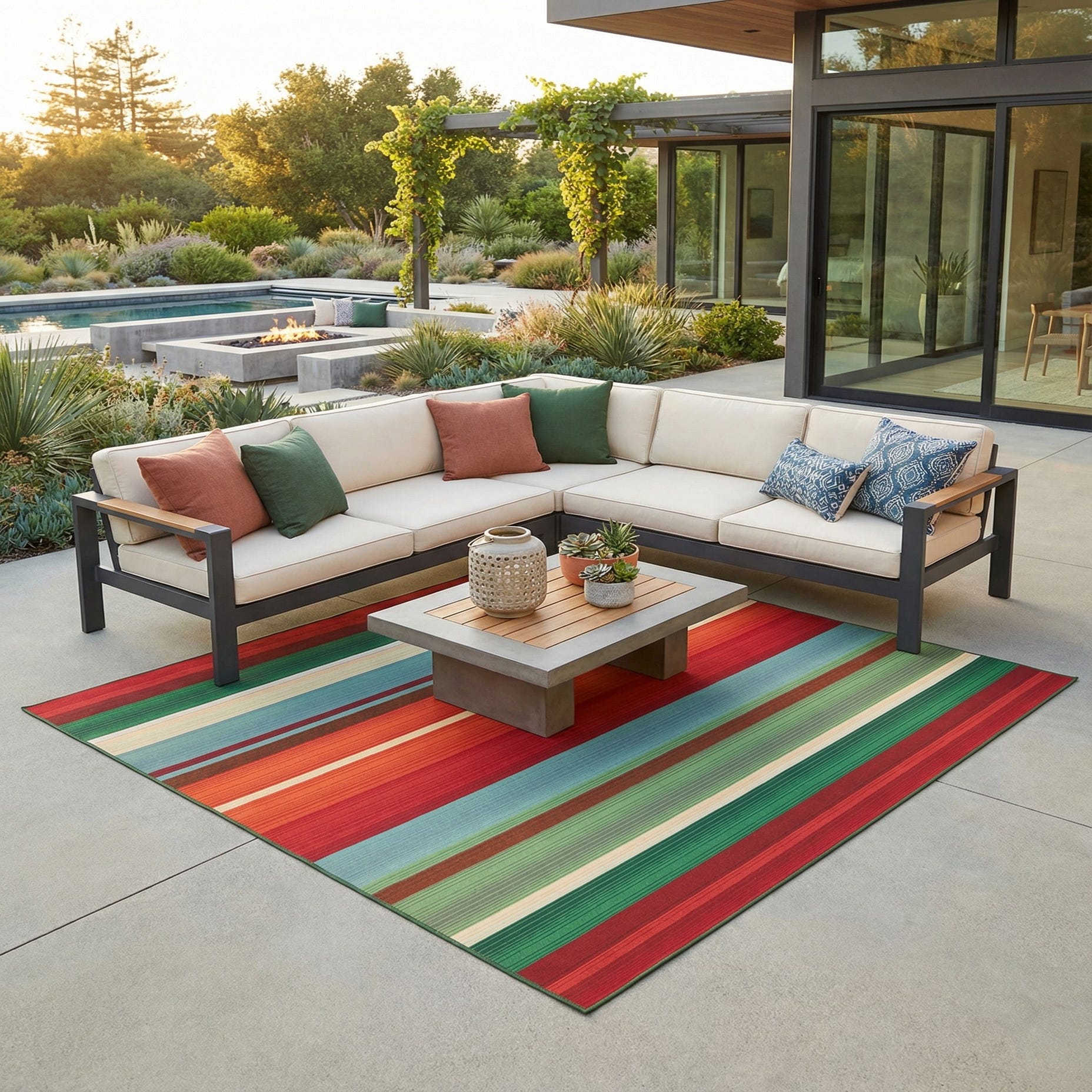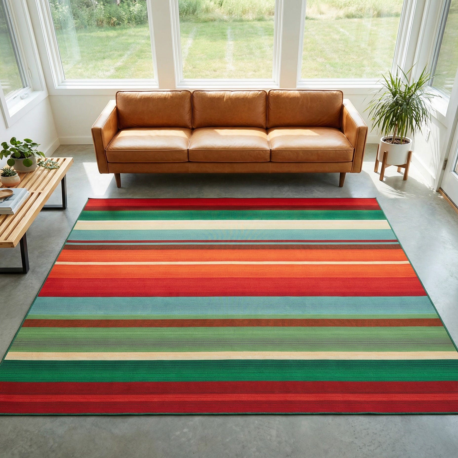 With its vivid color scheme, this rug can serve as an anchor for a lively patio, brighten up a sunroom, or add a splash of color to a minimalist modern space. The bold stripes can complement a range of decor styles from contemporary to eclectic, easily becoming a statement piece in any setting that embraces a casual and inviting atmosphere.