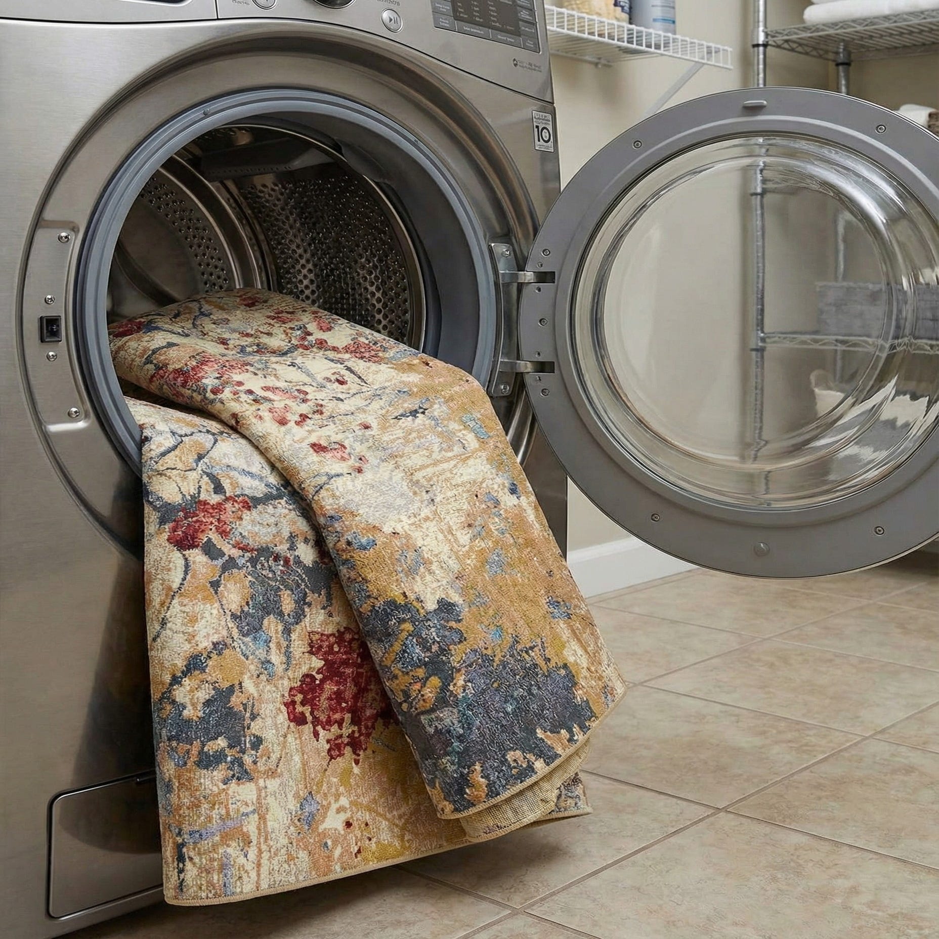 A multi-colored square rug with an abstract, painterly floral design in shades of gold, blue, red, and cream.
