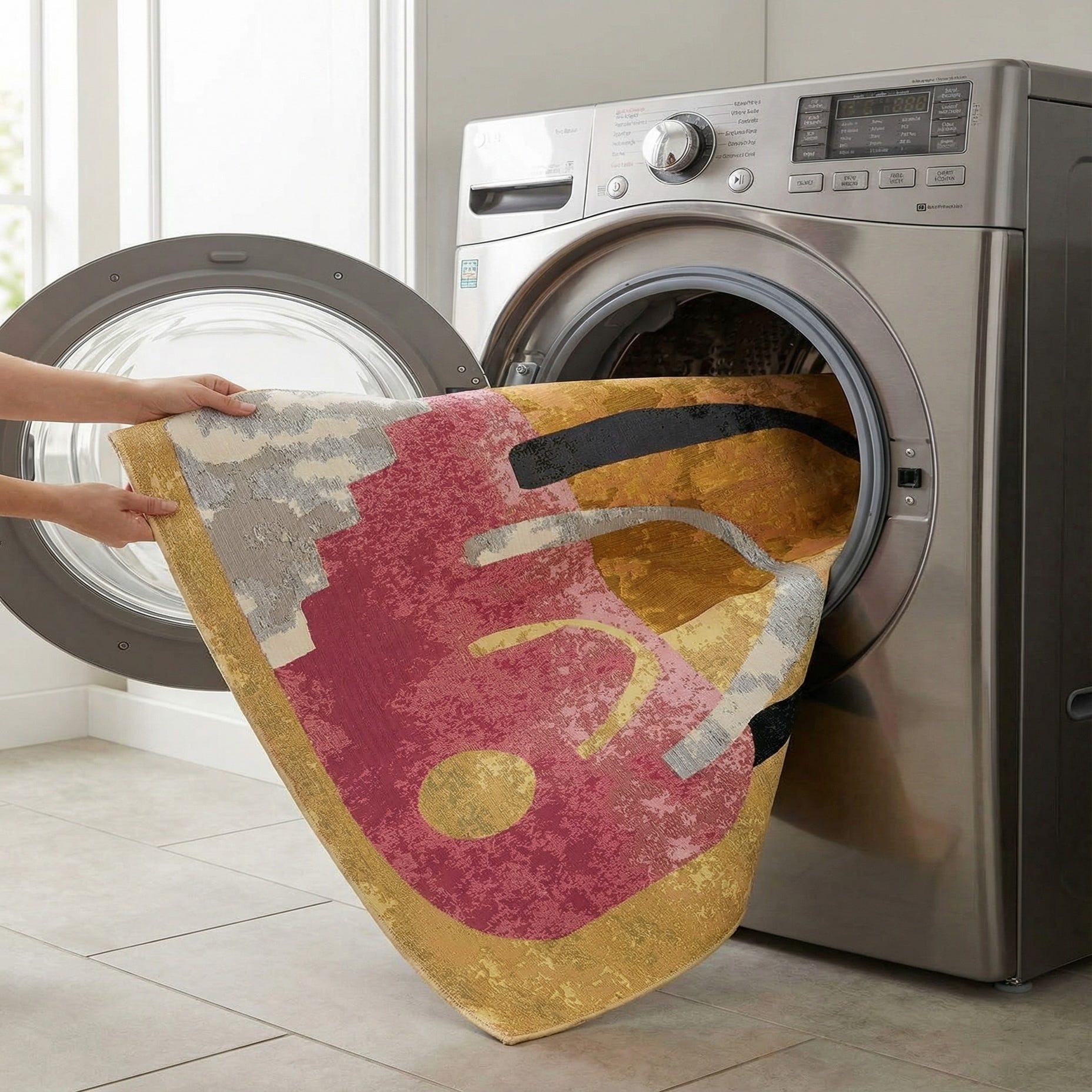 A bold, modern composition of overlapping organic shapes and arches gives this rug a graphic, artful presence. The multi background supports a painterly, distressed overlay in warm tones—gold, light brown, orange and yellow—while a deep red-orange block and a small red circle add visual weight at the top. A large pink rounded form anchors the foreground with ivory and black arches arcing across it, and a pale gray stepped motif at the lower edge introduces a subtle geometric contrast. The palette also includes touches of ivory and black that sharpen the shapes and keep the design lively without feeling busy.