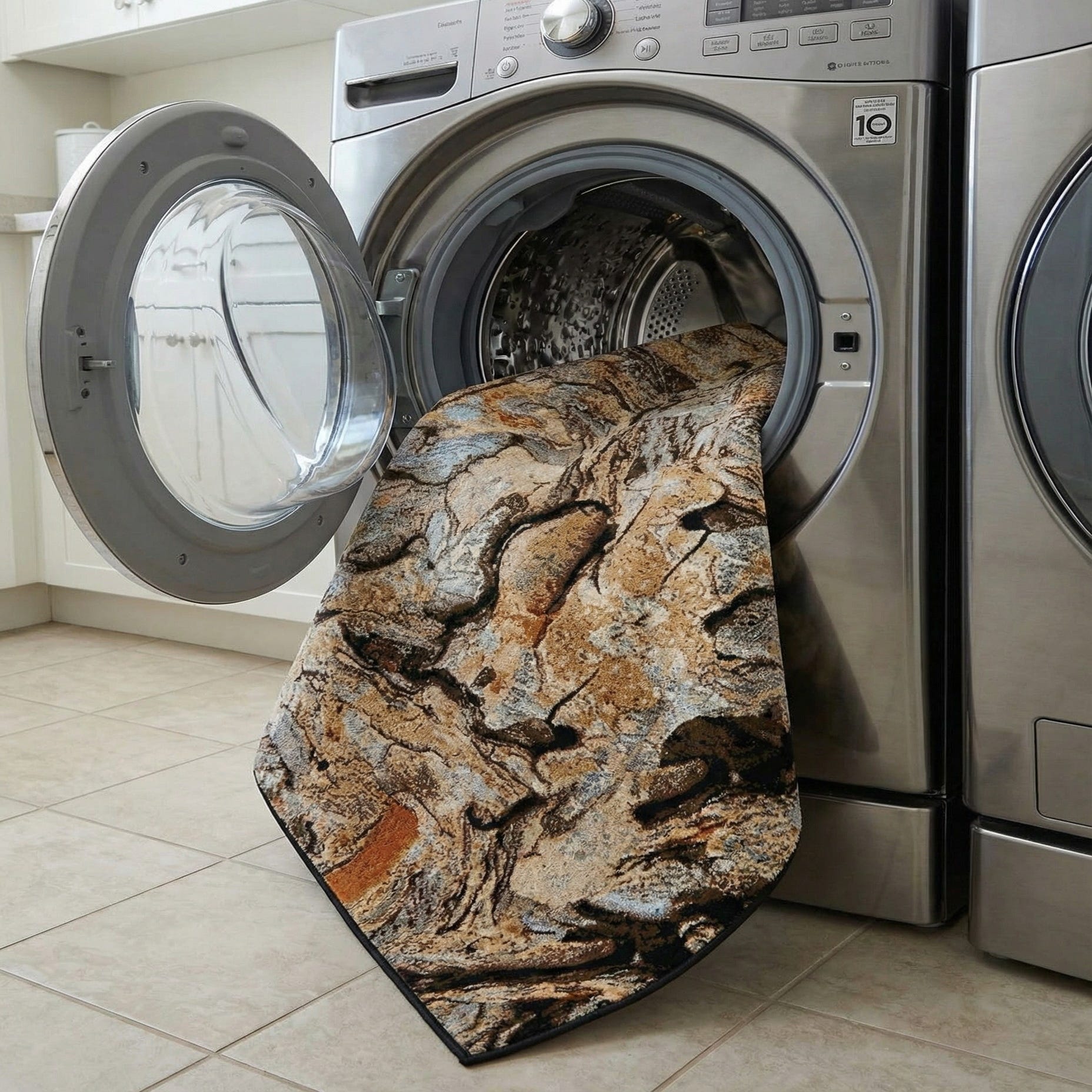 Warm and earthy, this rug pairs well with modern, transitional or rustic interiors. Use it on a covered patio or sunroom to echo natural surroundings, place it beneath a contemporary seating group to anchor leather or walnut pieces, or layer it in a dining area to add visual interest to neutral upholstery. The mix of neutrals and darker accents makes it easy to coordinate with linen textiles, matte-black hardware, and woven accessories for a cohesive, grounded look.