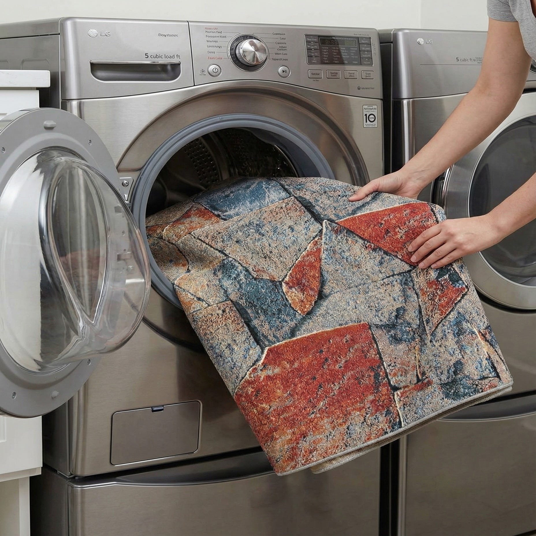 A multi-colored square rug with an abstract, contemporary stone-like pattern in shades of red, blue, and beige.
