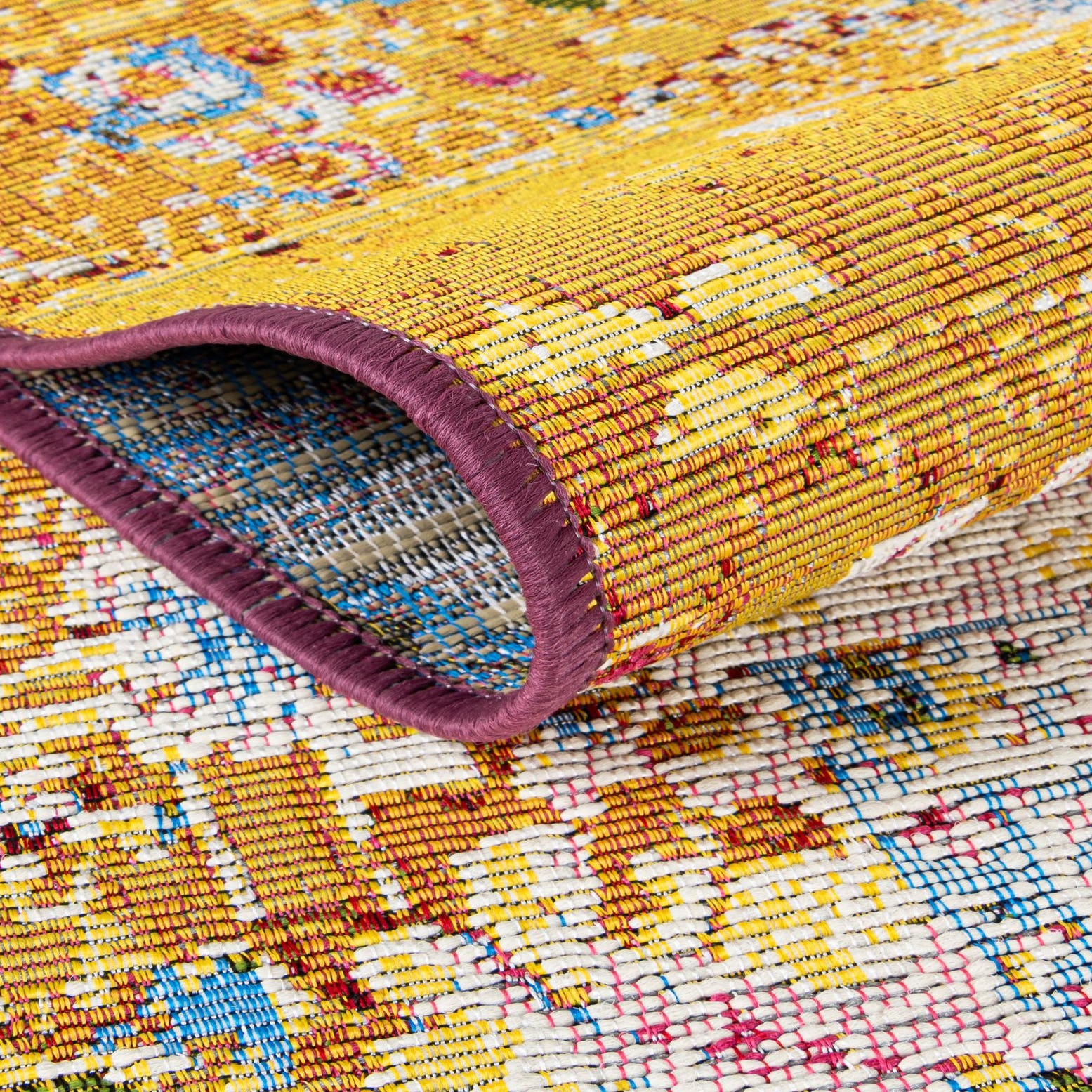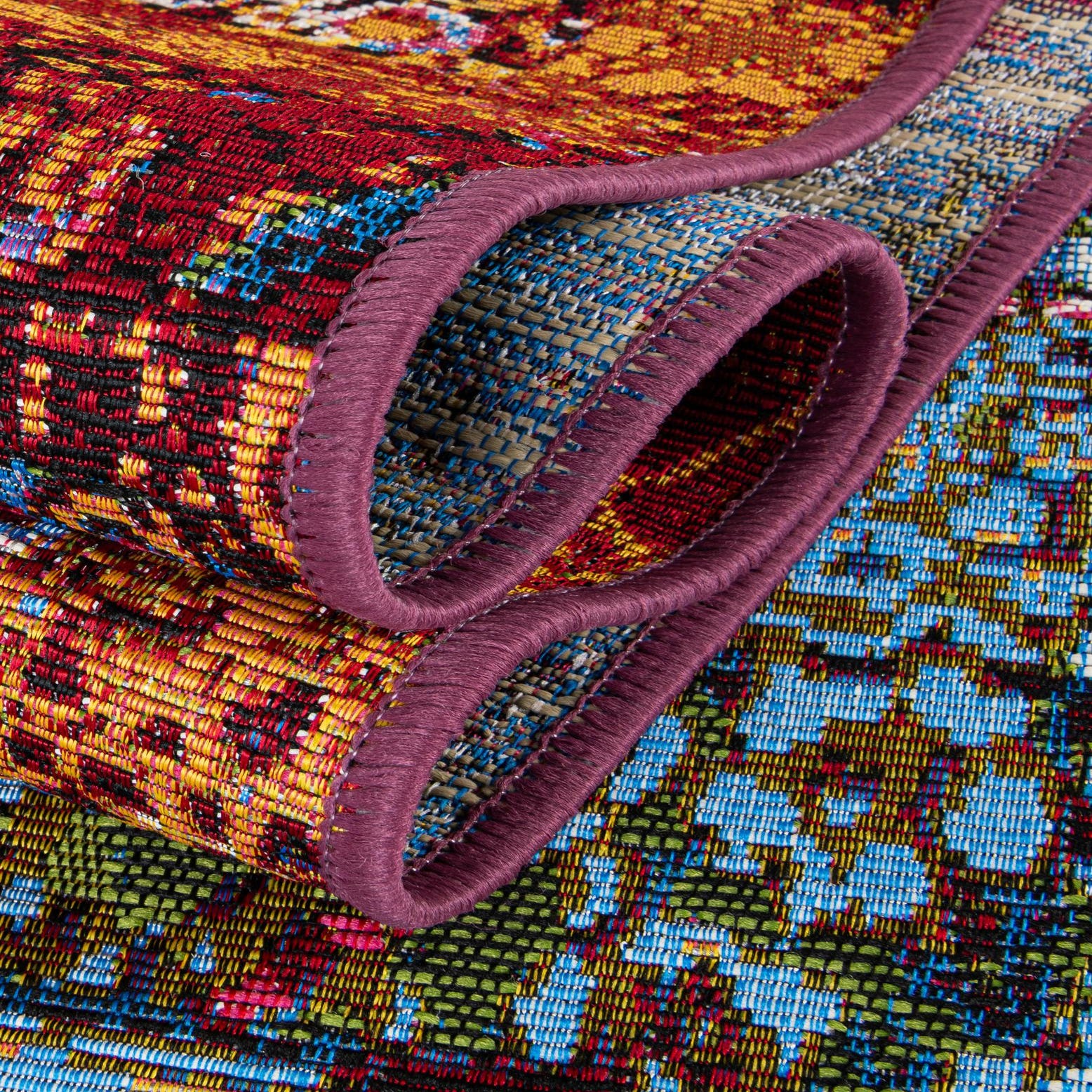 This rug fits well in contemporary or eclectic settings where color is a focal point: place it beneath a neutral outdoor seating group to energize a patio, anchor a sunroom with mixed-print cushions, or use it in a modern living room to tie together bold art and pared-back furniture. It also works in high-traffic indoor areas like a kitchen or entry, and can complement layered textiles in a bohemian-inspired bedroom.