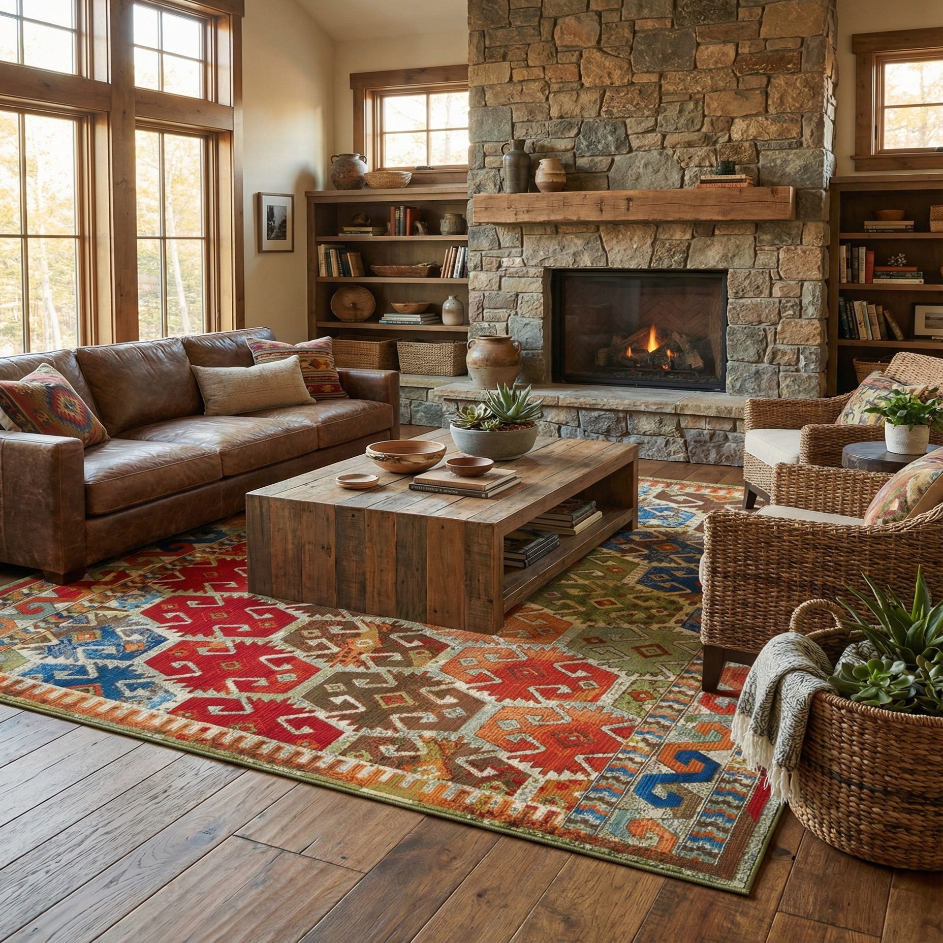 This palette and pattern work well in covered outdoor rooms, casual living areas, or an entry where you want color and pattern without excess height. Pair it with warm woods, leather seating and woven accessories for a relaxed, layered look, or let it be the anchor in an eclectic space with mixed metals and linen upholstery. The rug also complements neutral outdoor furniture and bold cushions in complementary blues or rust tones, making it versatile for patios, sunrooms and family rooms.