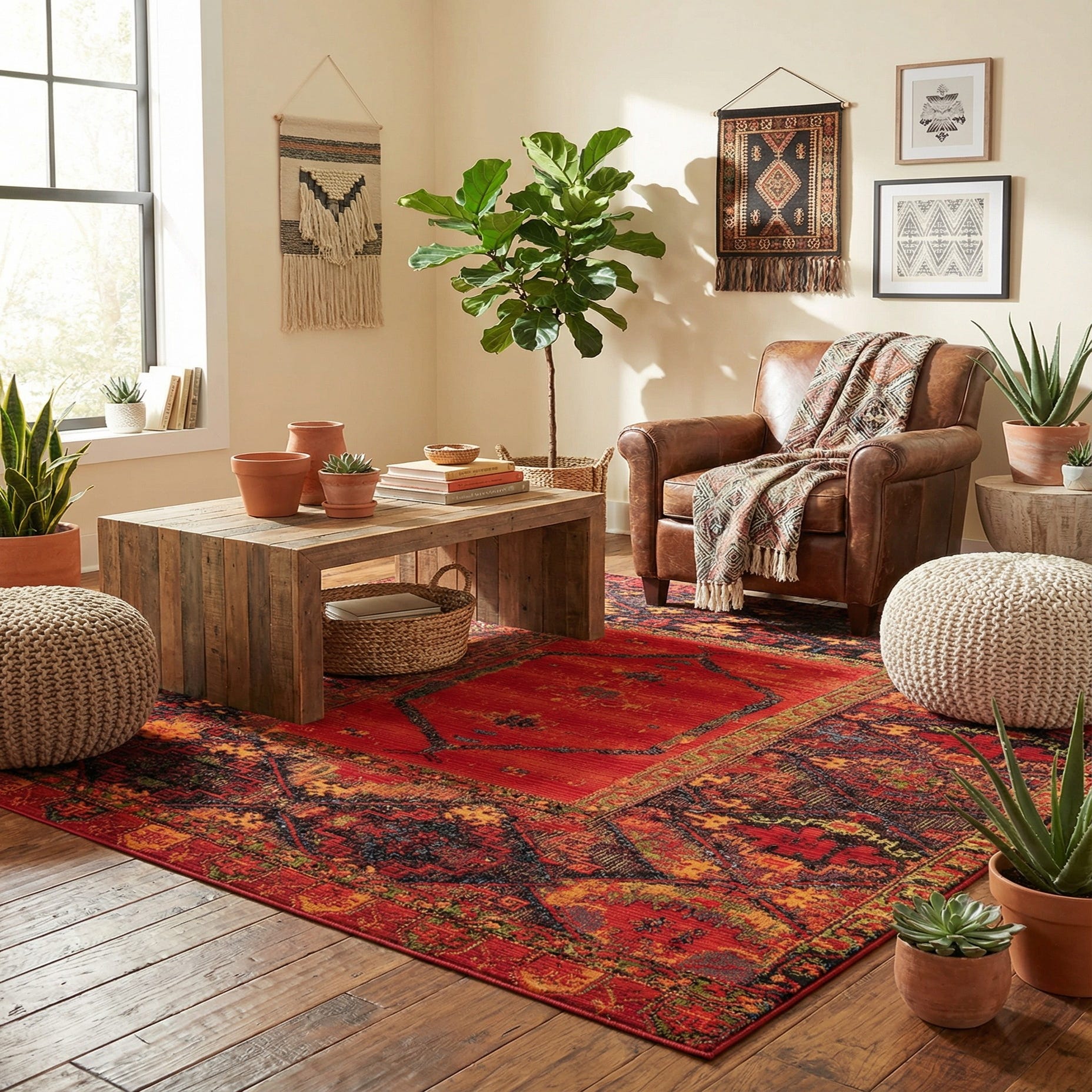 This rug works well in a bohemian or global-inspired living room layered with leather seating and warm wood tones, or under a round dining table to introduce rich color and pattern. It also complements industrial lofts and modern farmhouse interiors where the tribal motif adds contrast to neutral walls, and it can ground a sunroom or covered seating area to create a lively, welcoming focal point.