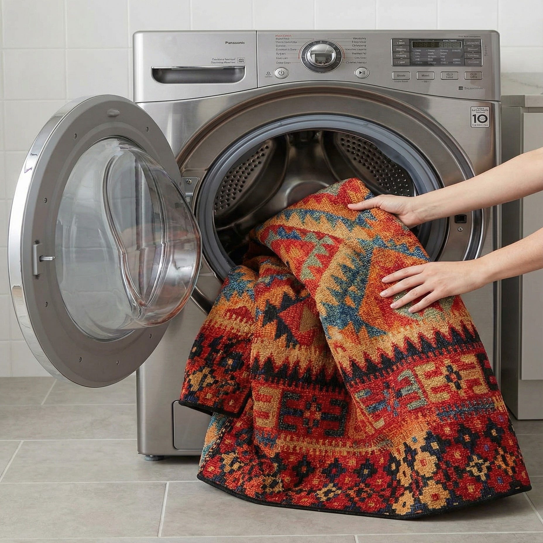 A bold tribal kilim-inspired field of stepped diamond medallions and serrated chevrons gives this rug a woven, handcrafted look. The multi background supports a warm, layered palette — navy and deep blue anchor the design while rust red, orange and terracotta bring warmth, and light blue, peach and tan highlights add contrast and depth. Narrow banded borders and small geometric motifs frame the center pattern, and the overall effect is rhythmic and structured without feeling fussy. Running your hand across the surface reveals a low, slightly textured hand that echoes the tactile quality of traditional flat-weave rugs.