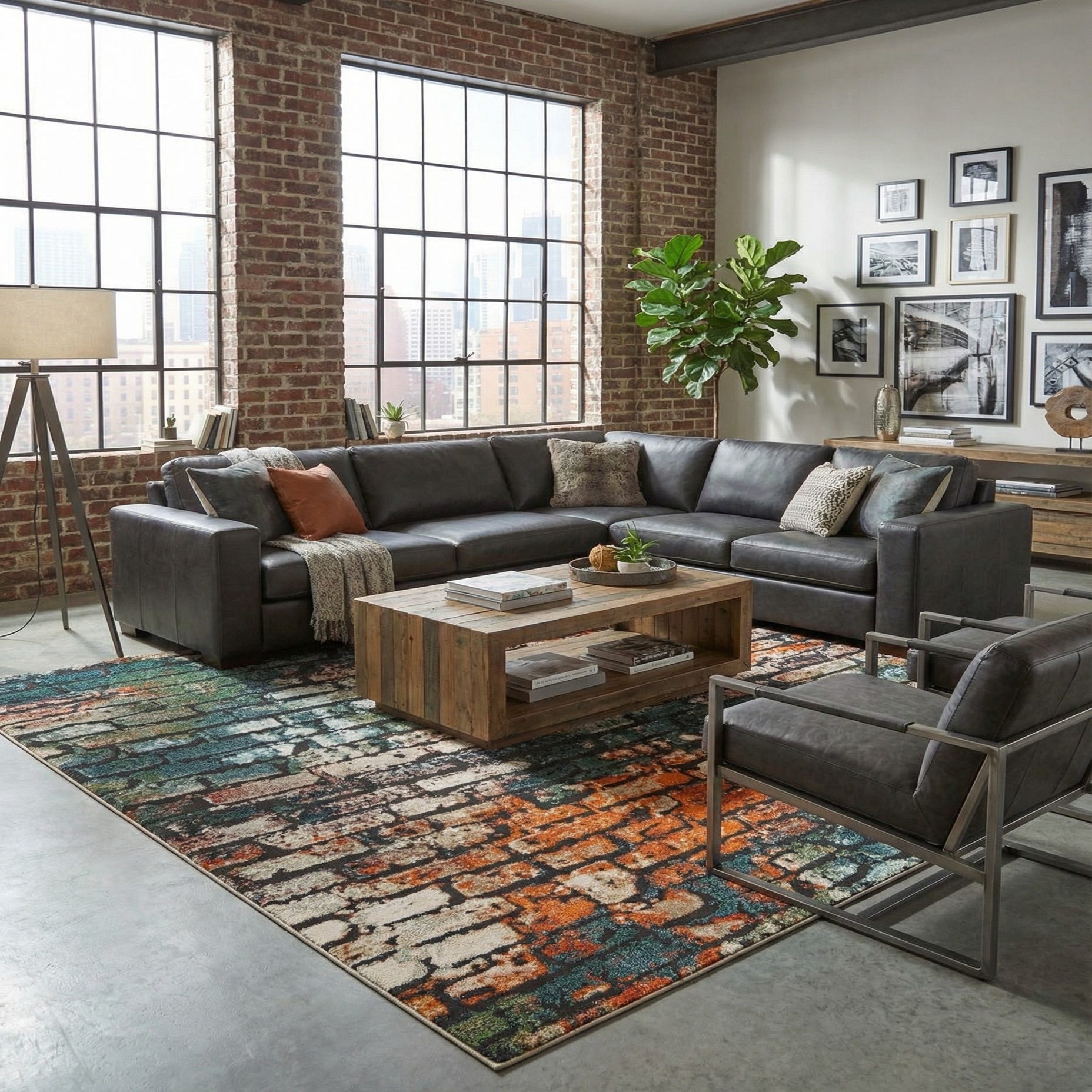 A square multi-colored rug with a distressed brick wall pattern, featuring shades of orange, green, and black.