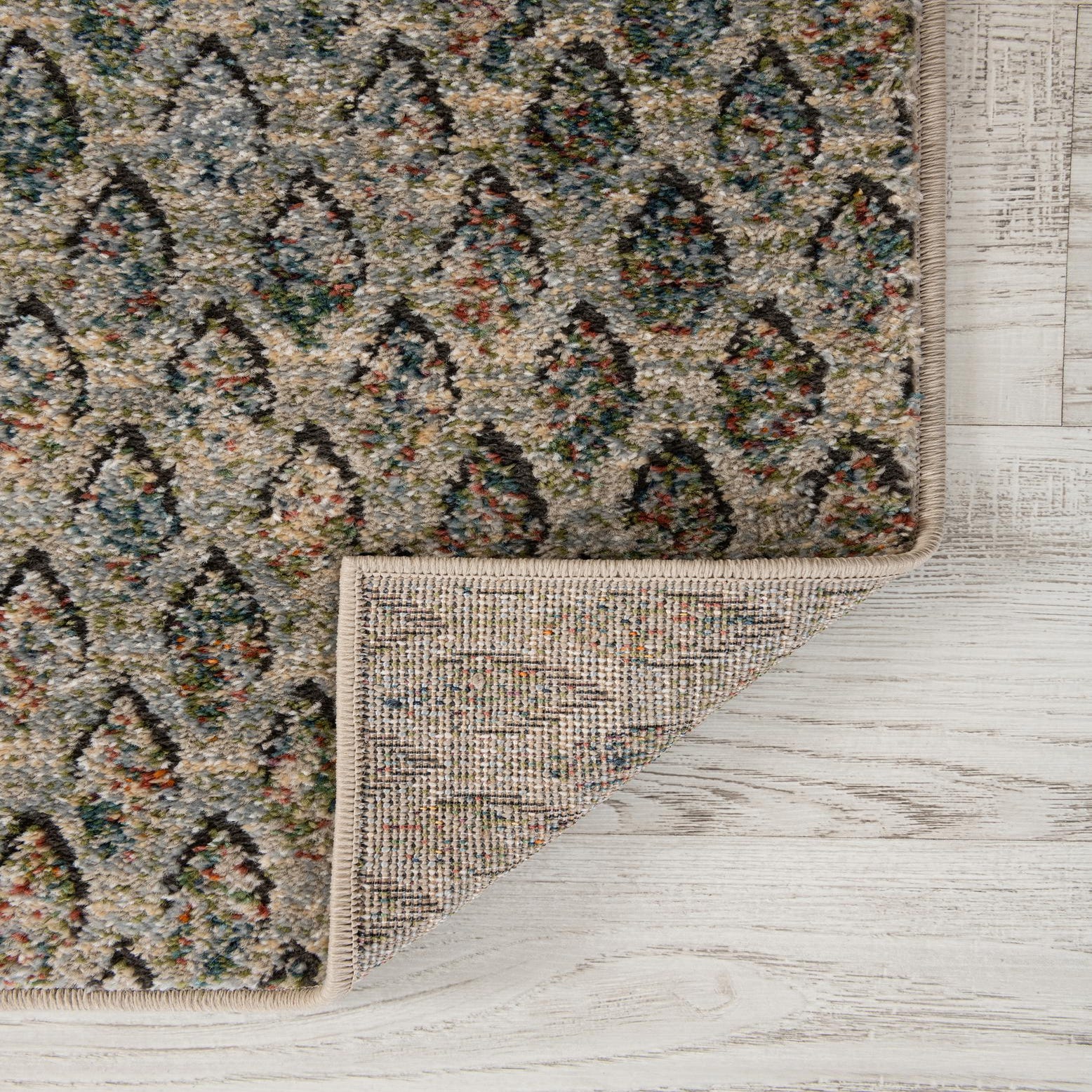 A square multi-colored rug with a textured, diamond-like pattern in shades of beige, green, and brown.