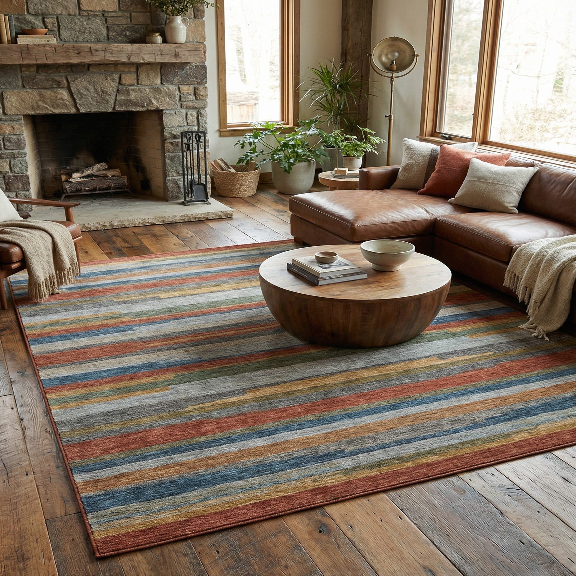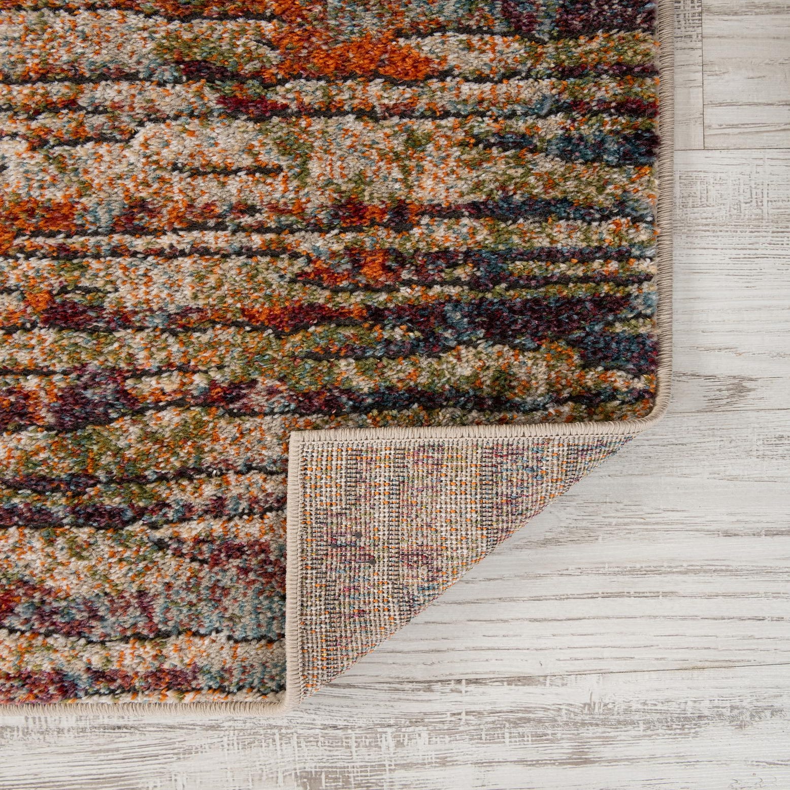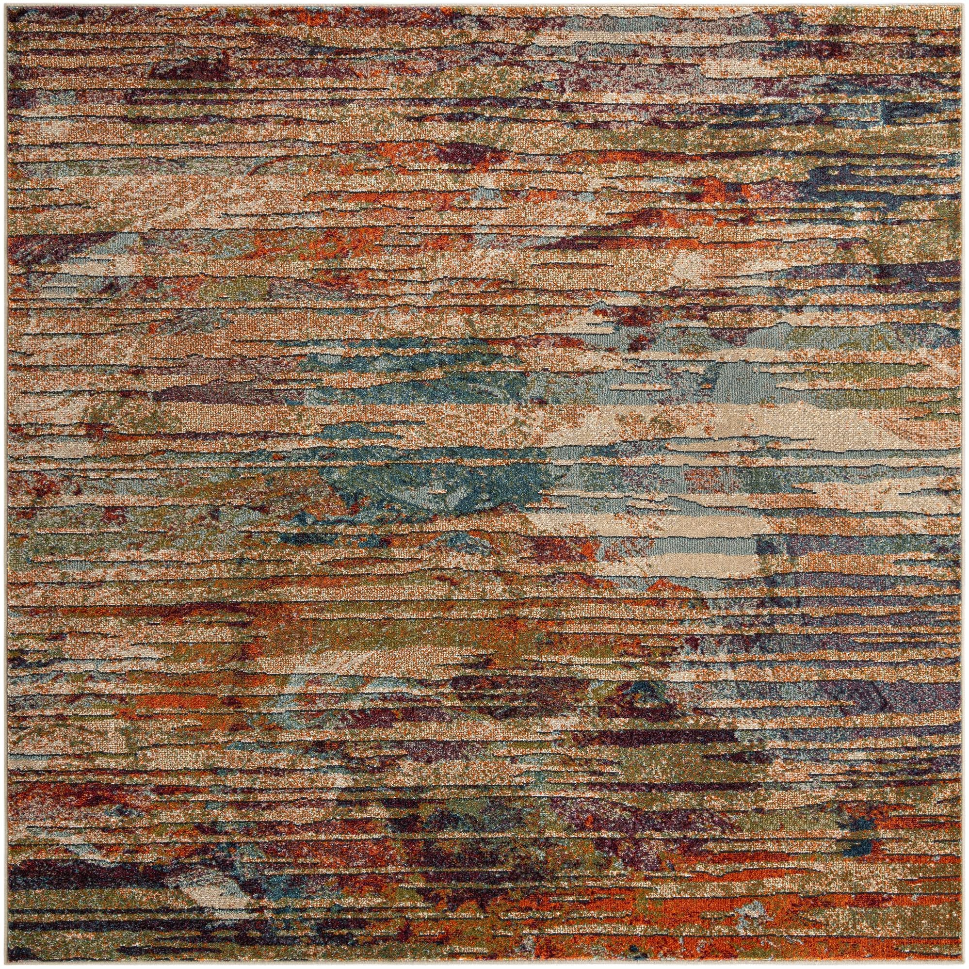 A square multi-colored rug with an abstract, textured stripe pattern in shades of orange, blue, green, and beige.