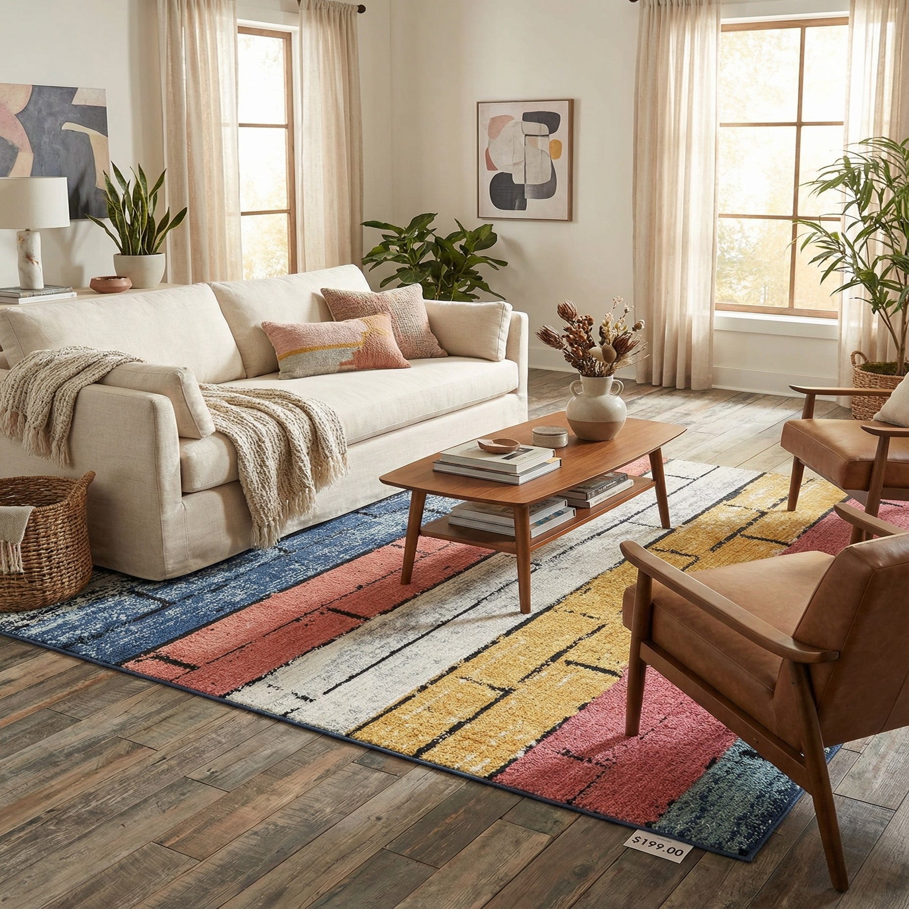 This rug fits clean, contemporary interiors as well as more eclectic or coastal-inspired rooms. Use it to anchor a seating area under a coffee table, brighten a home office, or add playful color to a family or playroom. It pairs well with neutral sofas, warm wood furniture, matte black metal accents, or layered textiles in navy, blush and ivory to pull out the rug’s varied hues.