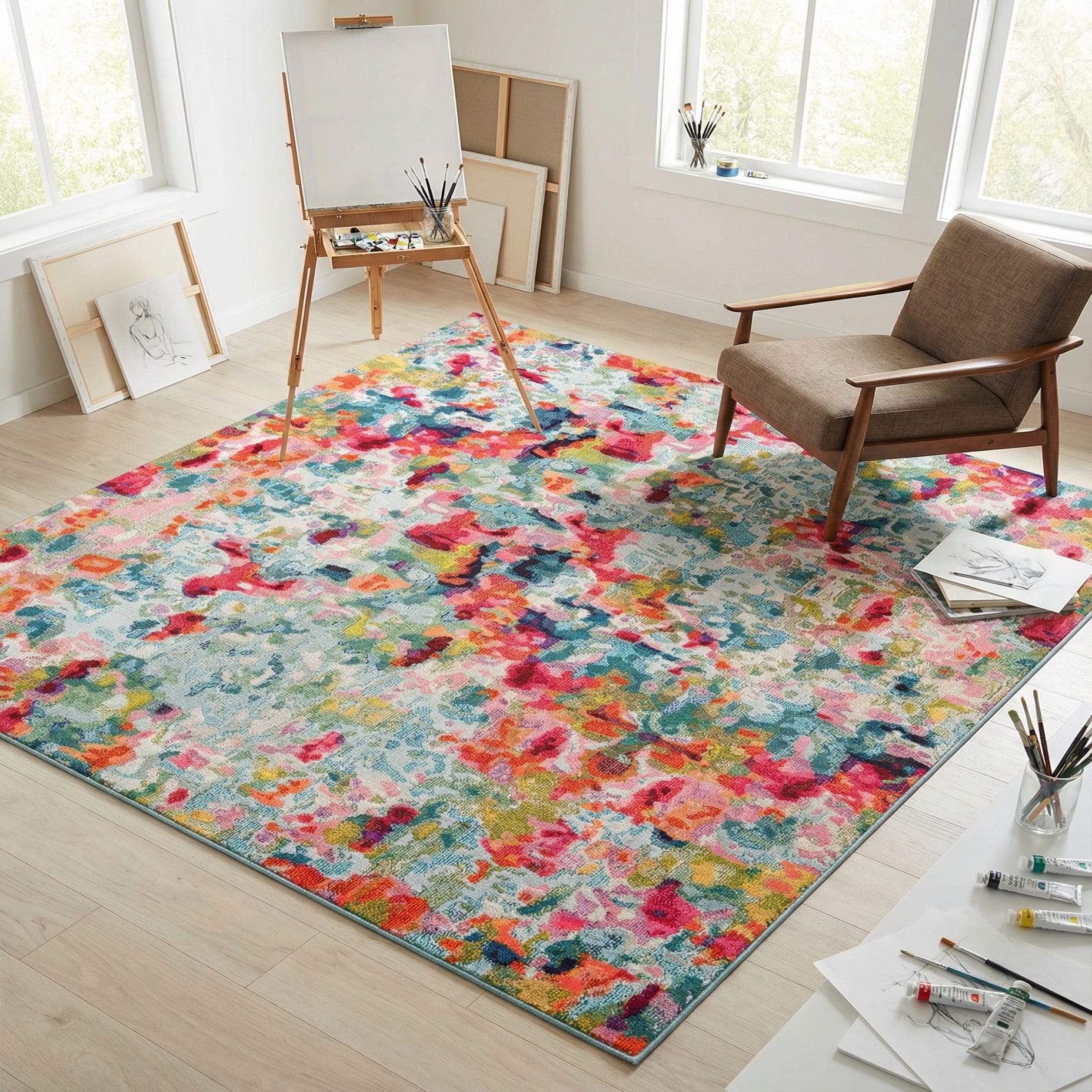 A lively, abstract pattern of overlapping color fields gives this rug a painterly, contemporary look. The multi background supports splashes of blue, light blue and teal alongside warmer notes of gold, olive, red and pink, with pockets of green and ivory that add contrast and depth. The overall effect is energetic but balanced, with the colors working together to form a loose, non-repeating motif that complements both bold and neutral furnishings.