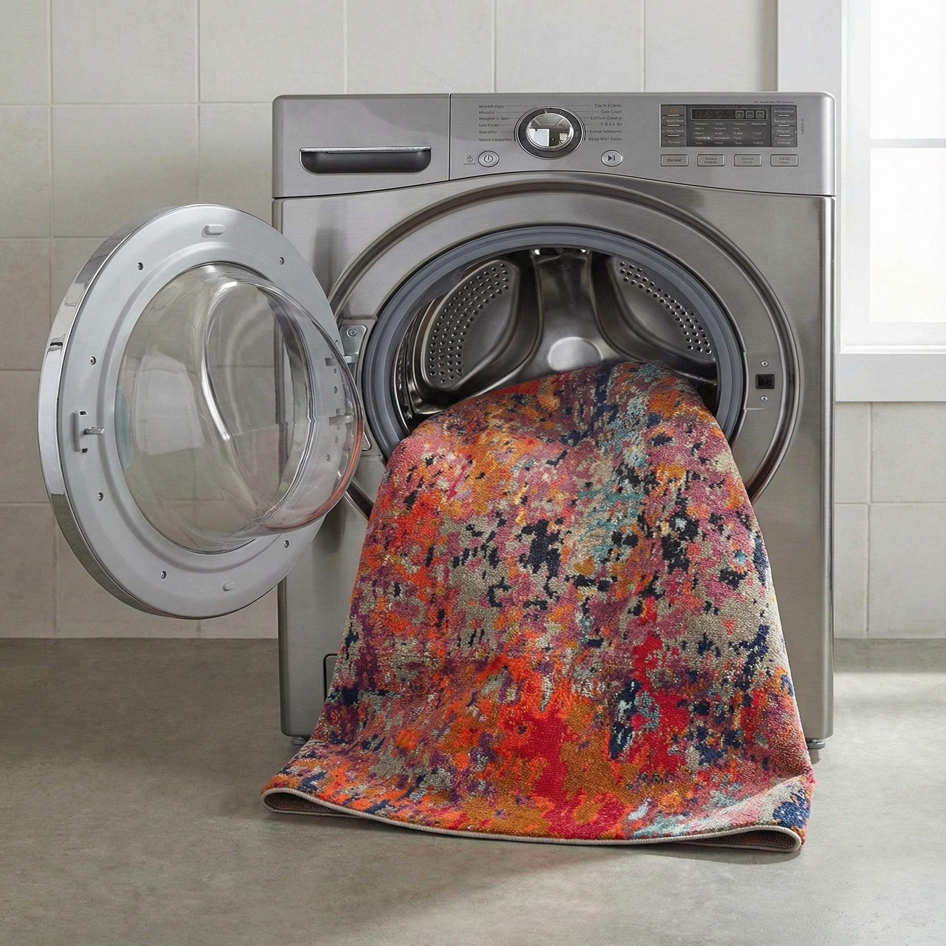 A bold, painterly abstract in a multi-colored ground, this rug layers splashes of orange, red, pink, and violet over fields of beige, gray, navy and black for a dynamic, contemporary surface. The pattern reads like a digital watercolour—areas of concentrated color break into fine, pixel-like speckles and distressed washes that create movement across the floor. Machine made from 100% polypropylene, the construction delivers a low-profile, tightly woven texture that feels smooth underfoot while keeping the pile visually compact.