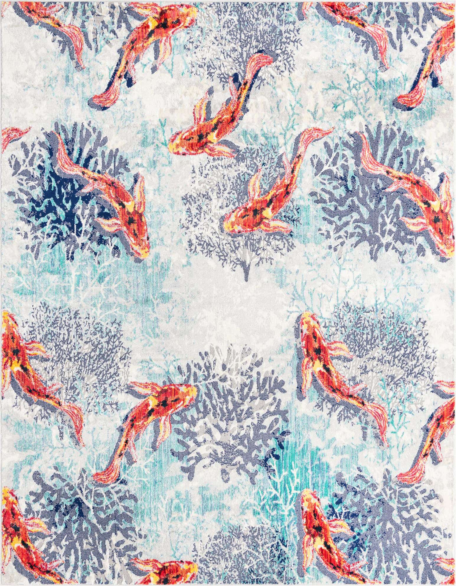 The Ariel Collection offers a vibrant and contemporary addition to any interior space with its dynamic pattern and rich color palette. This 8x10 rug showcases an abstract design with splashes of ivory, light green, navy blue, orange, and red set against a multi-colored background, combining both cool and warm tones. The machine-woven construction from 70% polypropylene and 30% polyester provides a soft texture while ensuring durability and ease of maintenance.