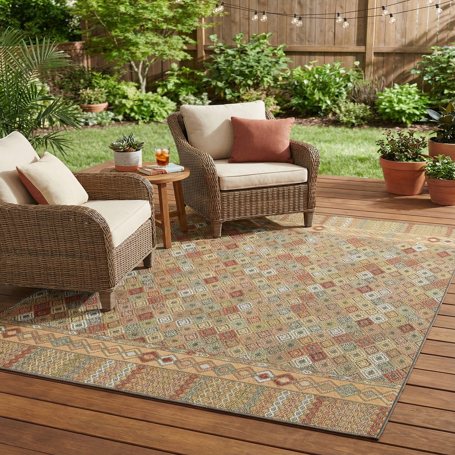 A compact, diamond-lattice pattern fills the field of this outdoor rug with a layered, kilim-inspired look. Small nested diamonds and intermittent larger medallions create a lively, rhythmic surface while narrow bands at each end provide a decorative border of linked geometric motifs and textured stripes. The multi background pulls together warm earth tones — beige, tan, terracotta, rust red and brown — with accents of burgundy, olive, light green, peach, orange and ivory. Machine made of 100% polypropylene, the low-profile weave feels slightly textured underfoot with a firm, tightly constructed hand that lies flat.