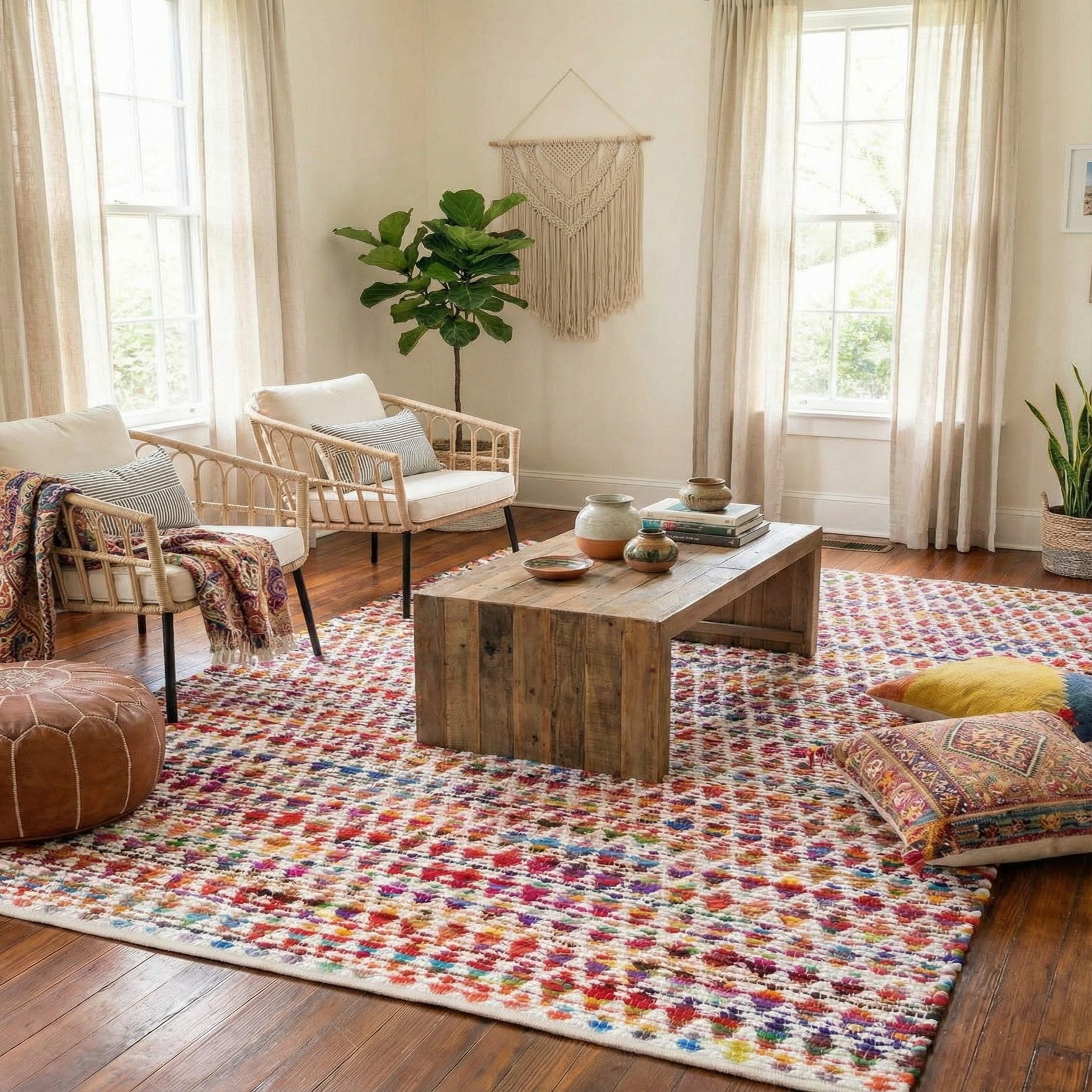 Bring this rug into casual living rooms to anchor a seating group, layer it under a dining table for a relaxed, textural foundation, or place it in a sunroom or playroom where mixed color palettes brighten the space. It pairs well with natural wood furniture, navy or ivory upholstery, and eclectic collections of pillows and throws, making it a versatile choice for farmhouse, coastal, or modern-bohemian interiors.