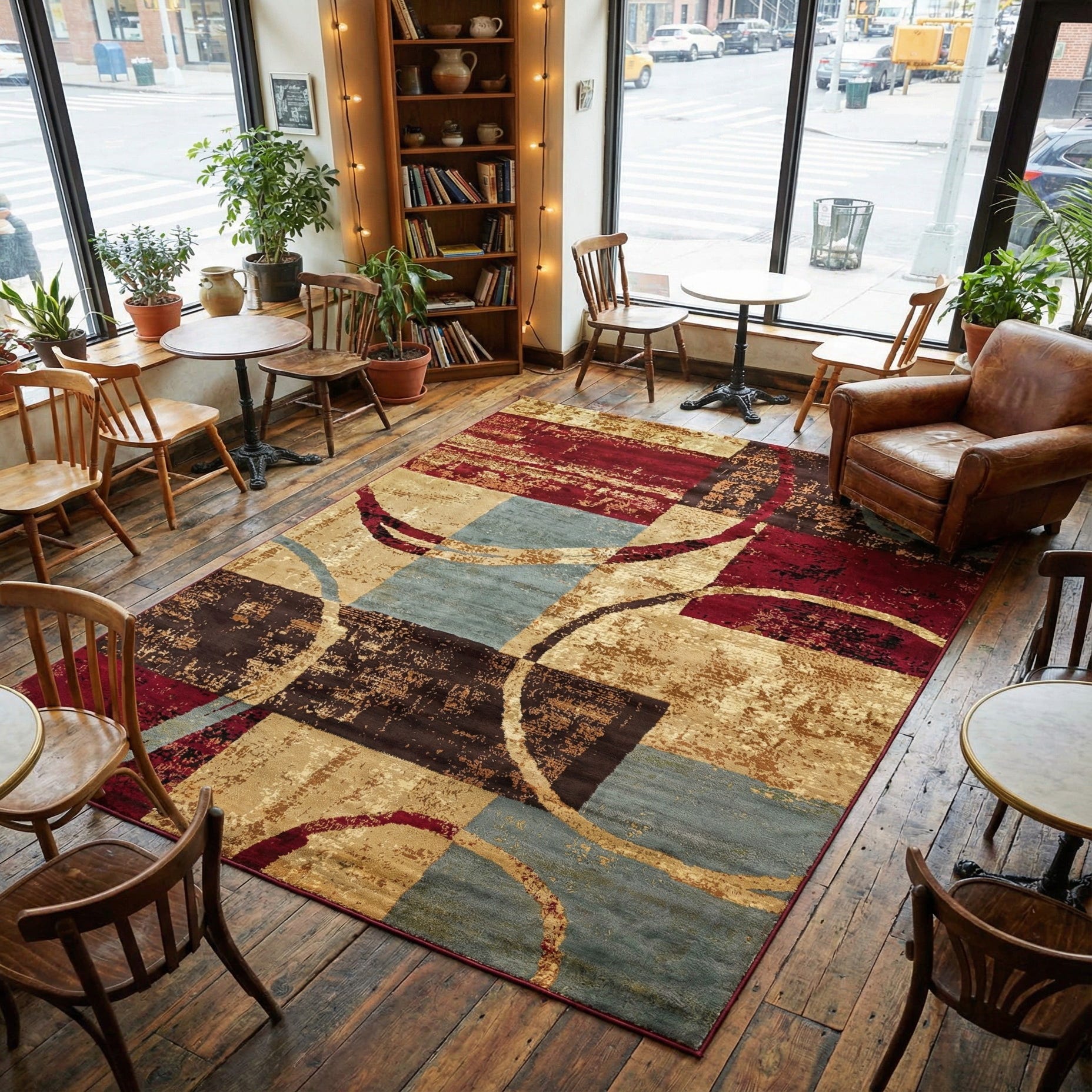 A bold geometric composition balances warm and cool tones across a multi background. Rectangular blocks of beige, brown, burgundy and gray are layered with distressed texture and subtle speckling, while sweeping circular bands in black, blue and olive arc across the surface to add motion. The overall effect is modern-transitional with a lived-in, vintage-inspired character that pairs structured geometry with soft irregularity.