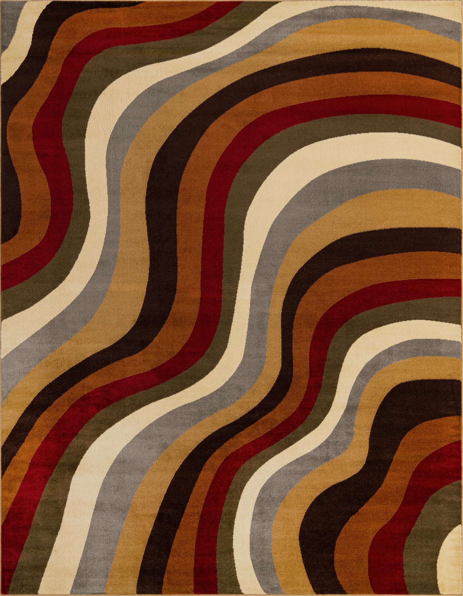 The Cafe Collection offers a machine-woven 8x10 area rug crafted from 100% polypropylene, ensuring durability and longevity. This rug displays a dynamic array of colors, including beige, brown, gray, light brown, maroon, olive, and red hues set against a multi-colored background. The bold, fluid waves create a sense of movement, making it a visually striking centerpiece for any room.