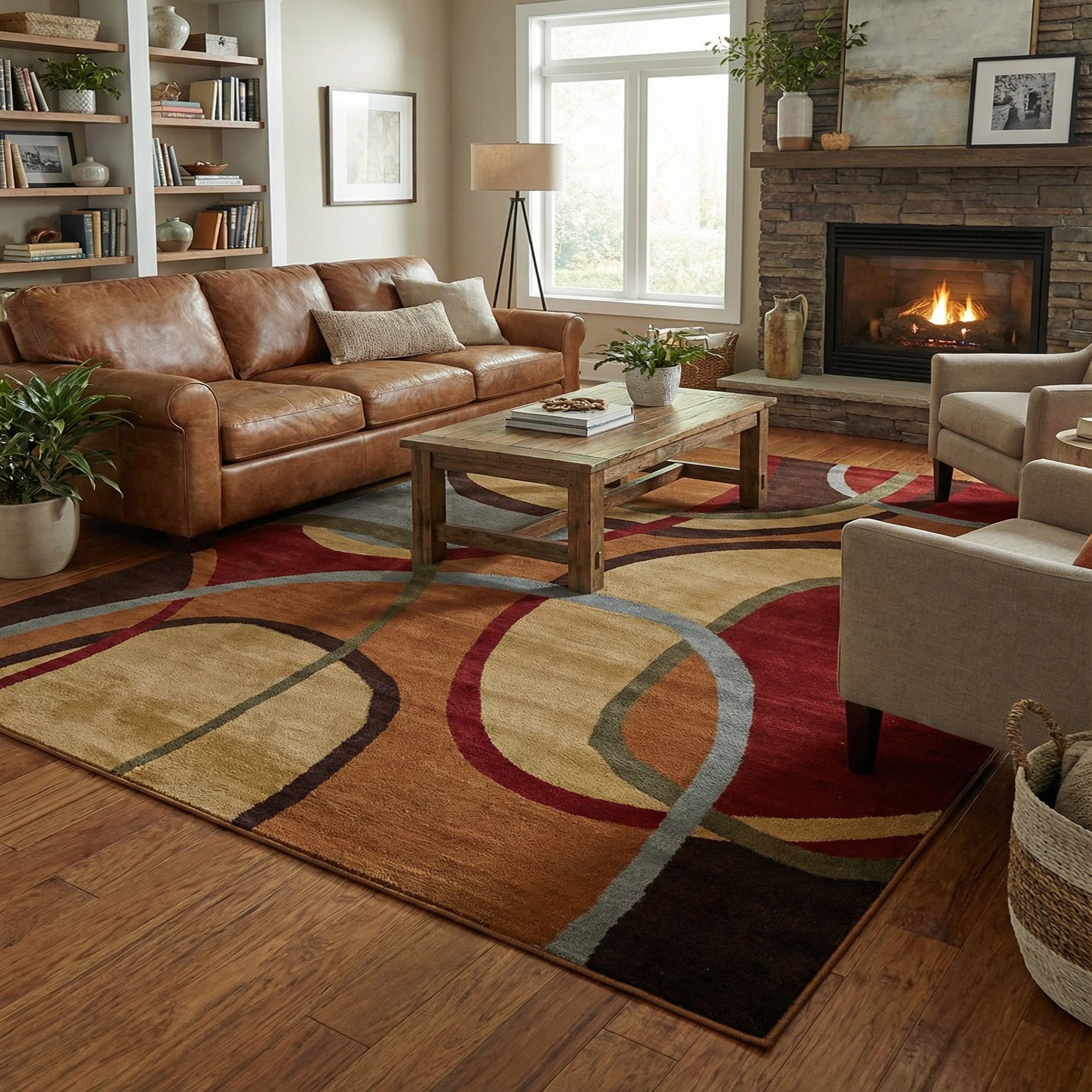 Works well as an anchor for a living area or under a coffee table to define seating; pair it with warm wood tones, cognac leather, or charcoal upholstery to complement the rug’s earthy reds and browns. It also suits contemporary or transitional spaces—place it in a home office to add visual interest beneath a desk, or use it in an open-plan loft where the bold shapes can help delineate zones.