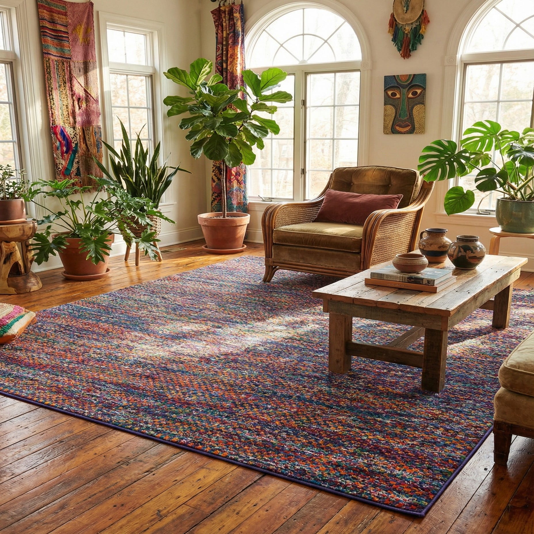 Machine-made from 100% polypropylene, the rug has a low, dense pile with a gently nubby hand you can feel underfoot. The tight construction keeps the multicolor pattern crisp and grounded, so it pairs naturally with mid-century modern seating, a neutral contemporary living room, or an eclectic bohemian mix of textures and prints. Use it to anchor a sofa and coffee table, layer beneath a rustic wood dining table, or bring color into a home office where you want an energetic yet controlled palette.