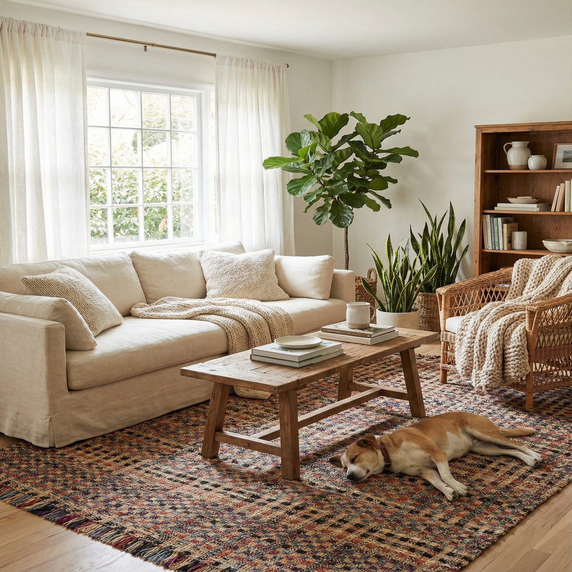 This rug pairs well with warm wood furnishings, leather seating, and layered textiles for a casual living room or den, and it also anchors a dining area beneath a natural wood table. Use it to add color and texture to a neutral entryway, or combine it with woven baskets, linen curtains, and mixed-metal accents for a modern bohemian or rustic transitional scheme. Its earthy tones and sturdy weave make it a versatile foundation for everyday spaces that favor tactile detail and lived-in character.