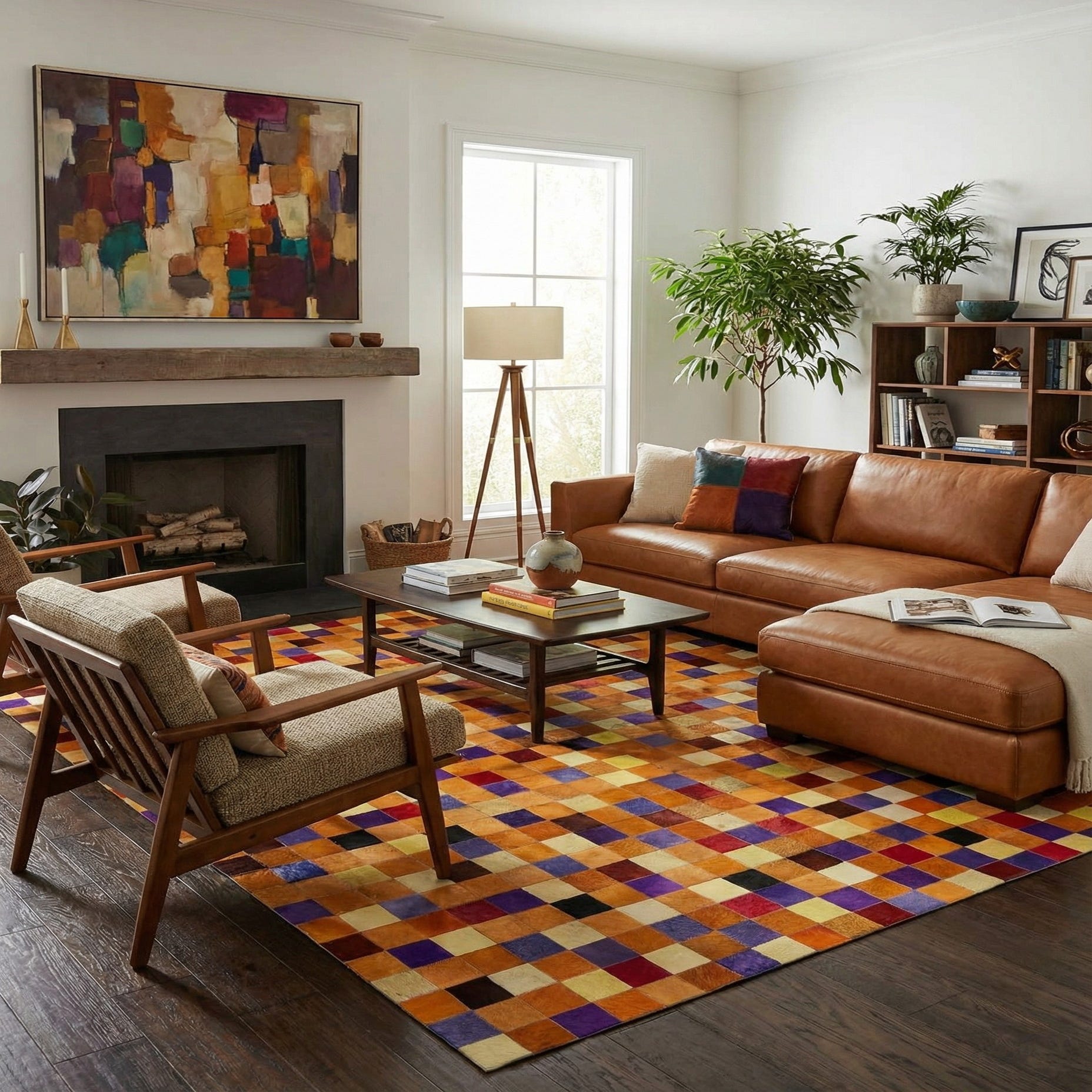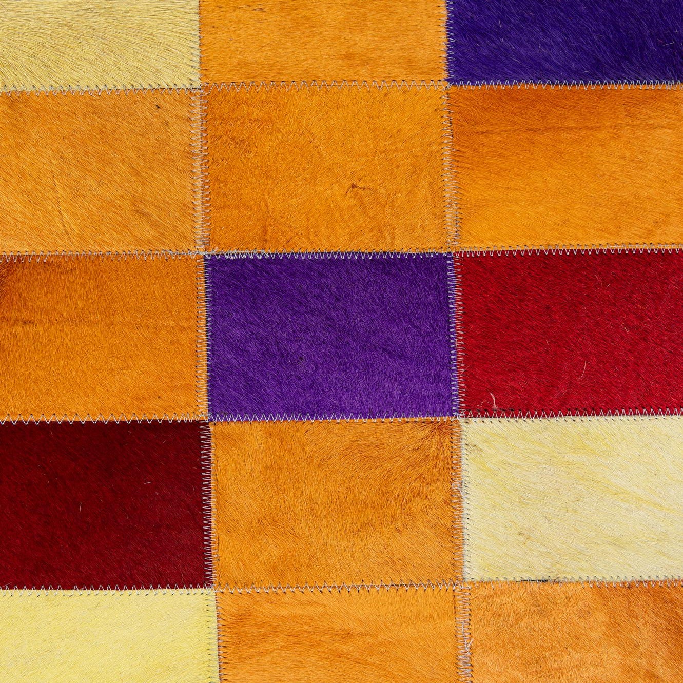 A rectangular 8x10 multi-colored cowhide patchwork rug with a modern design, featuring various shades of orange, yellow, red, purple, and black squares.