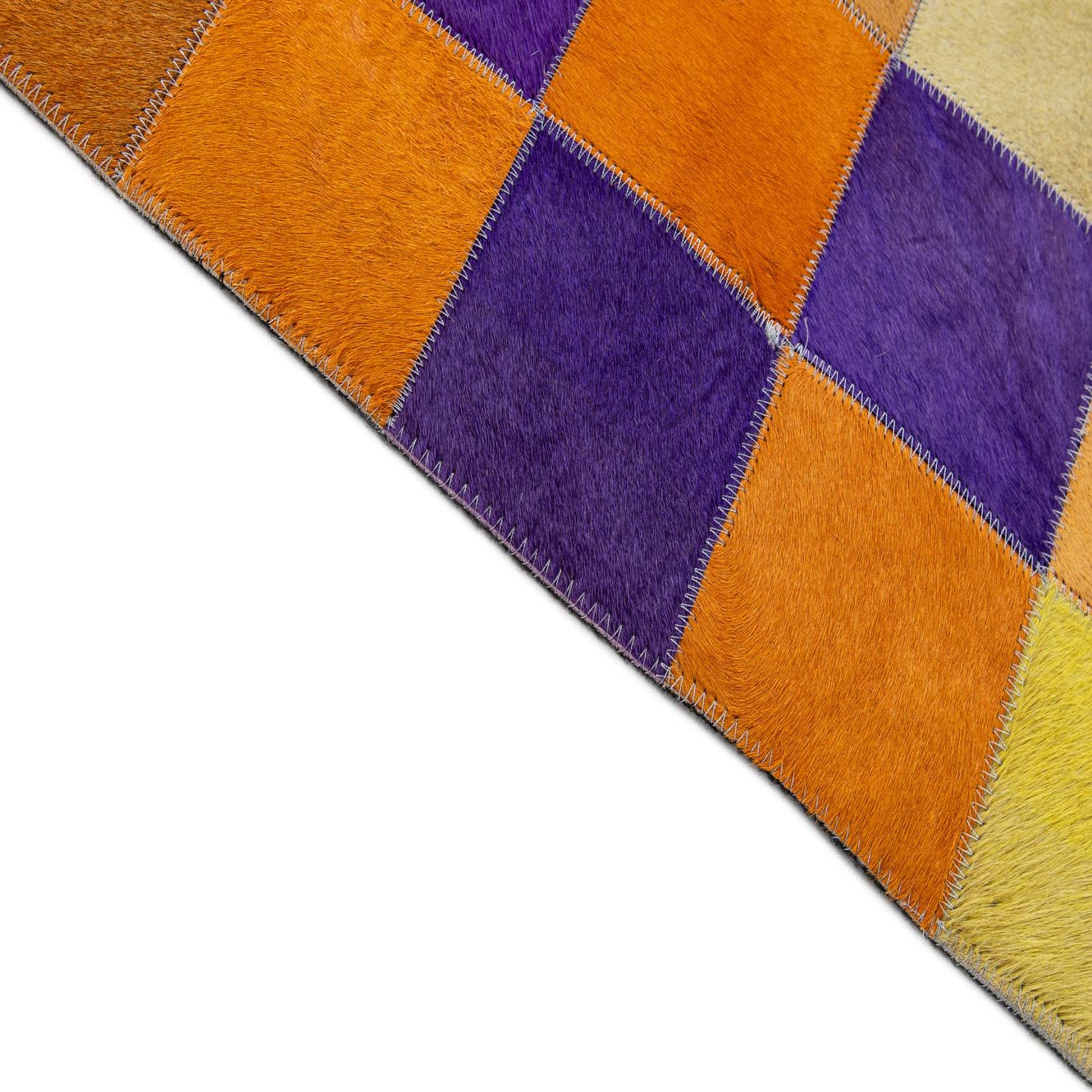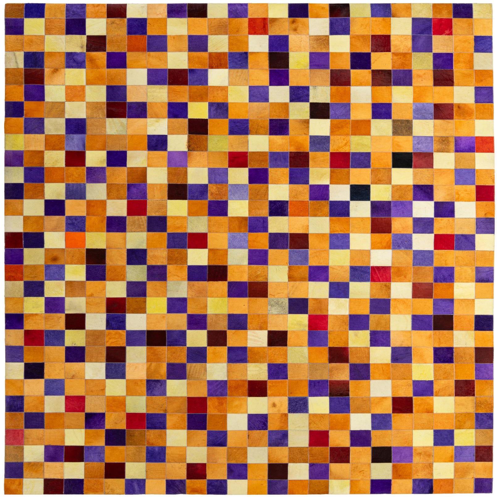 A tight patchwork grid of hand-cut squares creates a lively, geometric surface in warm, saturated hues. Squares of orange, purple, red and yellow are set against a multi-tonal background, forming a pixel-like pattern that balances order with playful color shifts. Handmade from cowhide and leather, the hair-on-hide finish offers a low, velvety nap and a subtle natural sheen; the seams between patches add gentle ridging and tactile interest while the leather joins provide durability and structure.