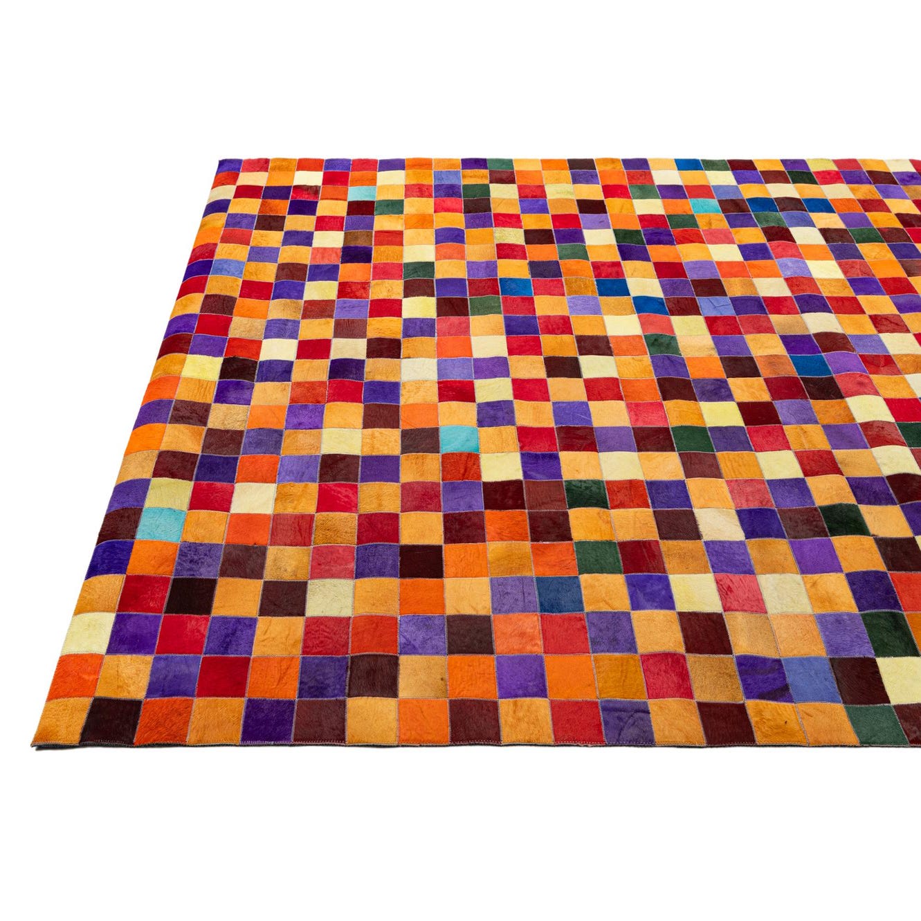 A tight, geometric patchwork of small square panels creates a vibrant checkerboard pattern that reads both modern and handcrafted. Warm oranges and reds sit beside rich purples and pops of green and yellow across a multi-tonal background, producing a lively, rhythmic surface. The rug is handmade from cowhide and leather, so each square carries a subtle hair-on-hide texture and a low, smooth nap with visible stitch lines where the pieces are joined, giving the rug a tactile, layered quality and a gentle sheen as light plays across the hide.