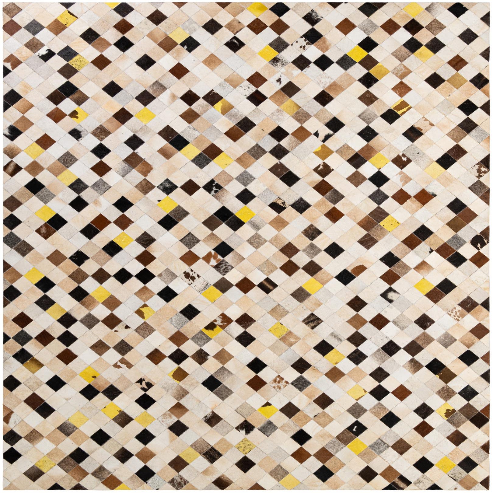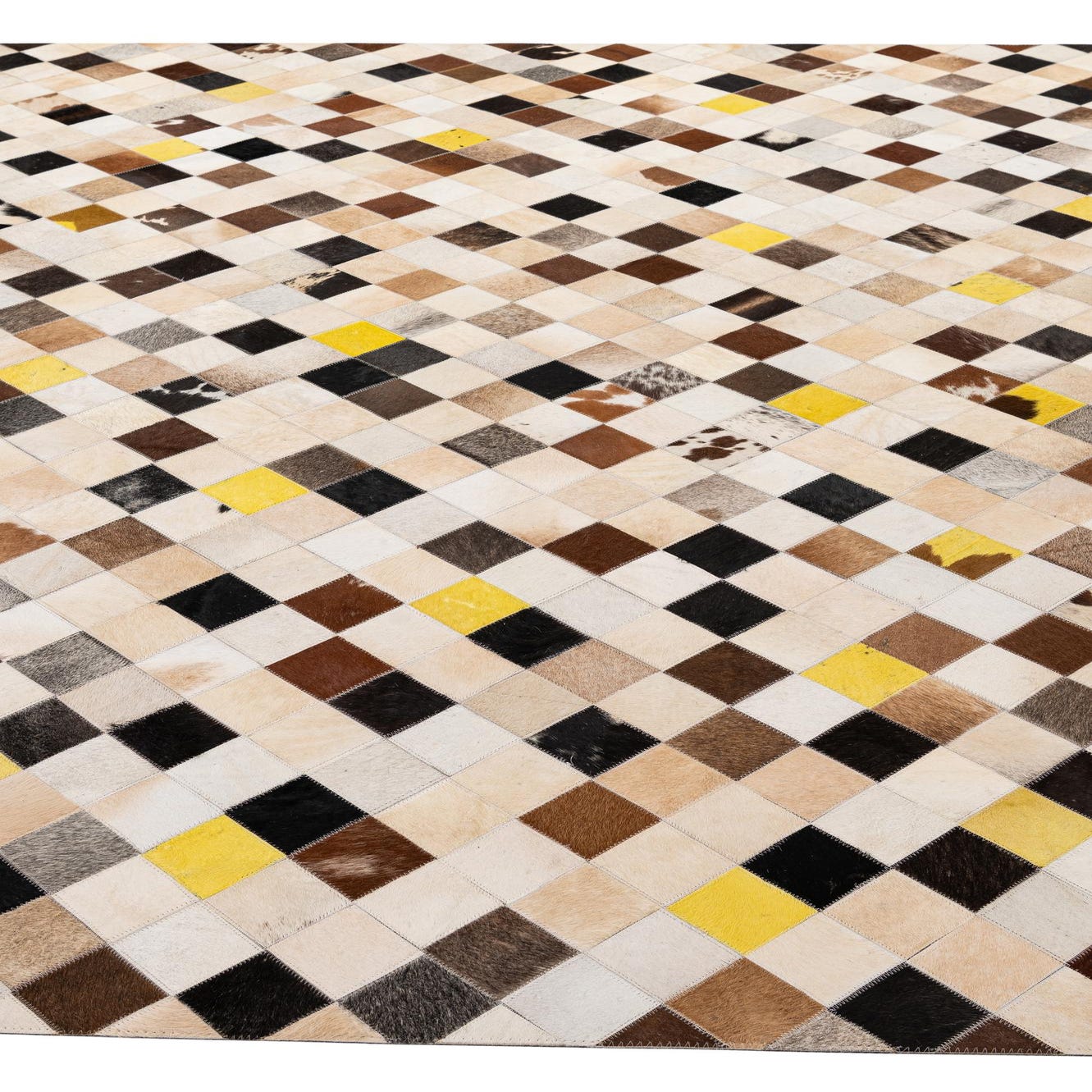 8x10 rectangular modern patchwork cowhide rug with multi-colored squares in brown, black, cream, and yellow.