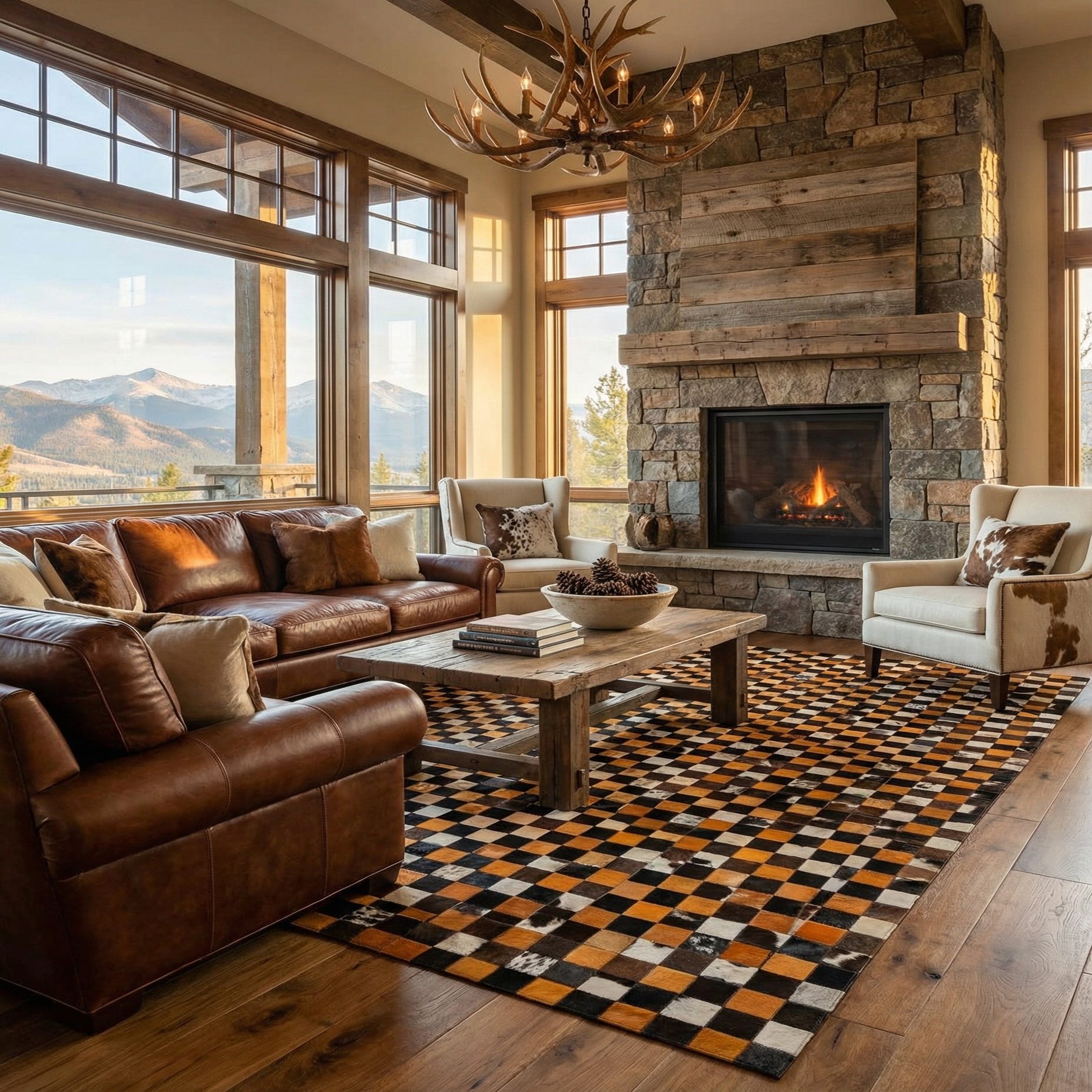A rectangular 8x10 modern cowhide patchwork rug featuring a checkerboard pattern of black, white, brown, and orange squares.