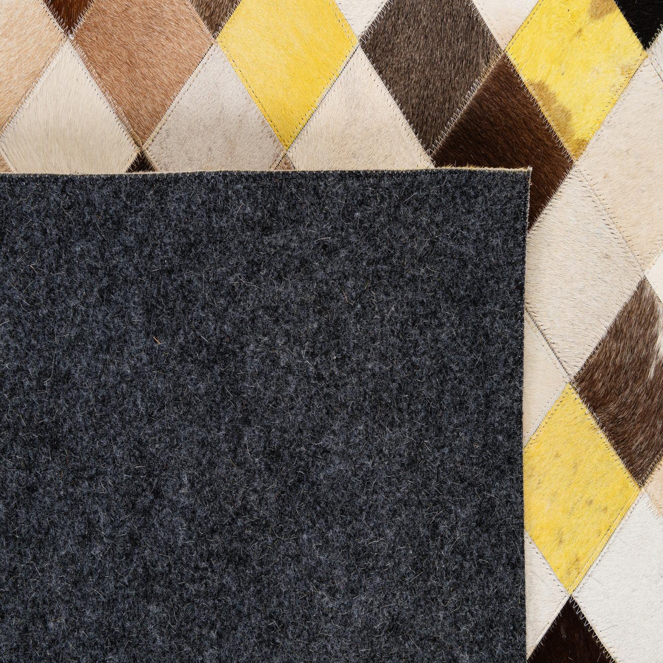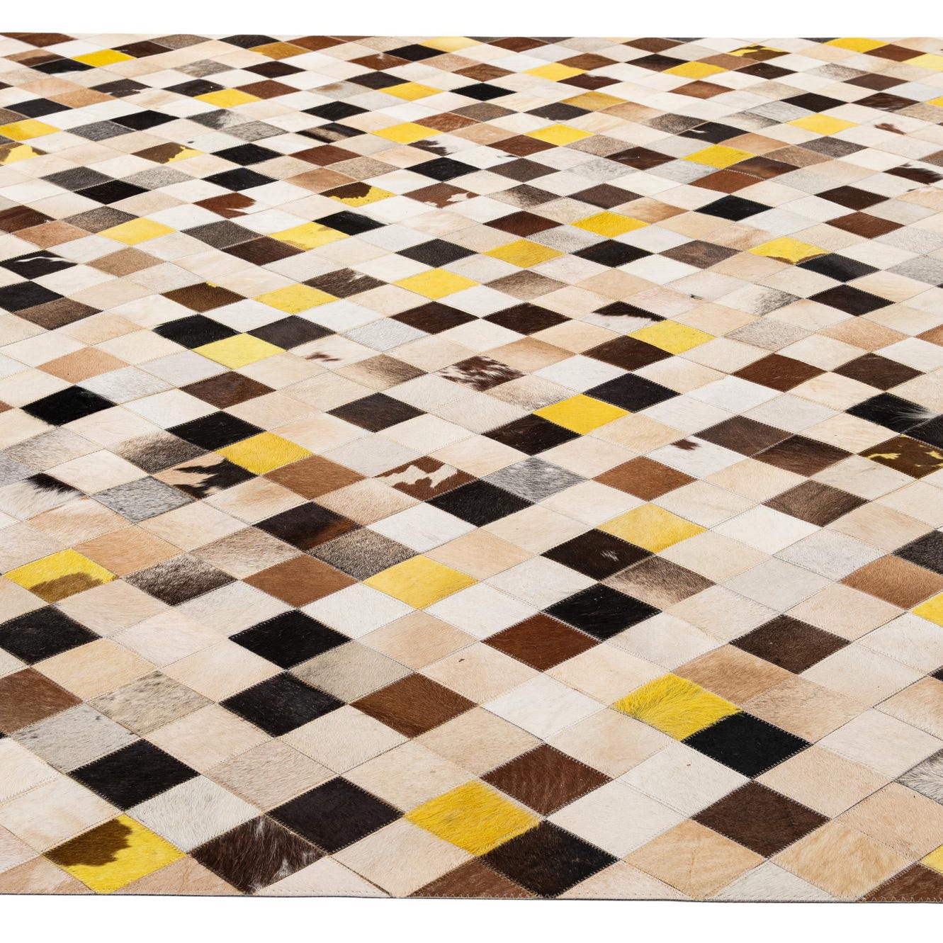 A rectangular 8x10 modern cowhide patchwork rug featuring a diamond pattern in multi-colored natural tones and bright yellow.