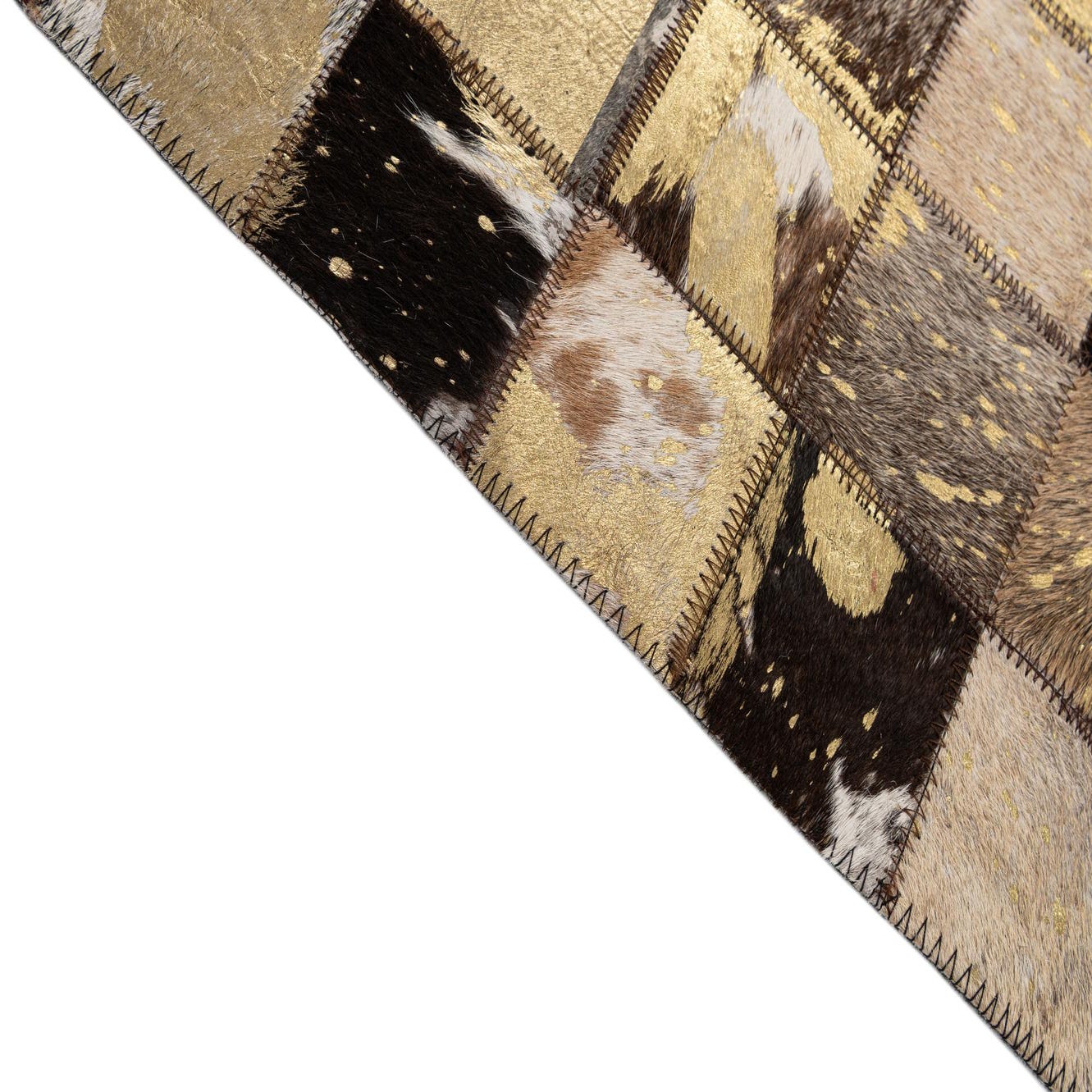 8x10 rectangular Cowhide Patchwork rug featuring a modern multi-colored mosaic of natural cowhide squares with metallic gold accents.